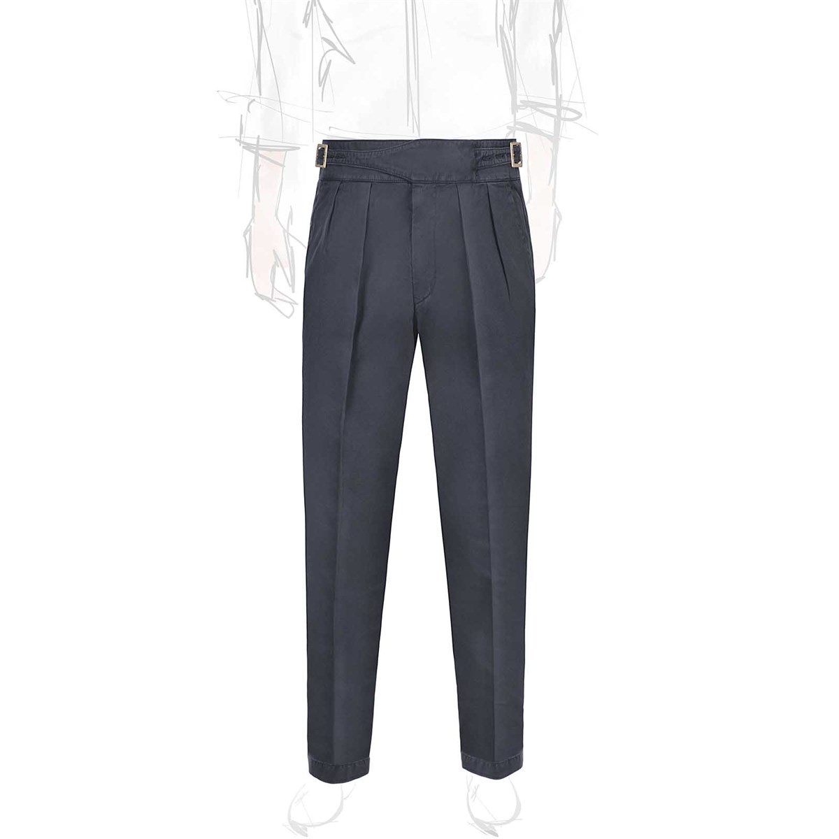 Designed with a high waist and unique adjustable tabs, these trousers ensure a perfect fit without the need for a belt, allowing for effortless style and ease of movement. The rich navy blue color adds versatility, making them suitable for both casual and formal occasions. Pair them with a tailored shirt for a polished look or a simple tee for a relaxed weekend vibe.