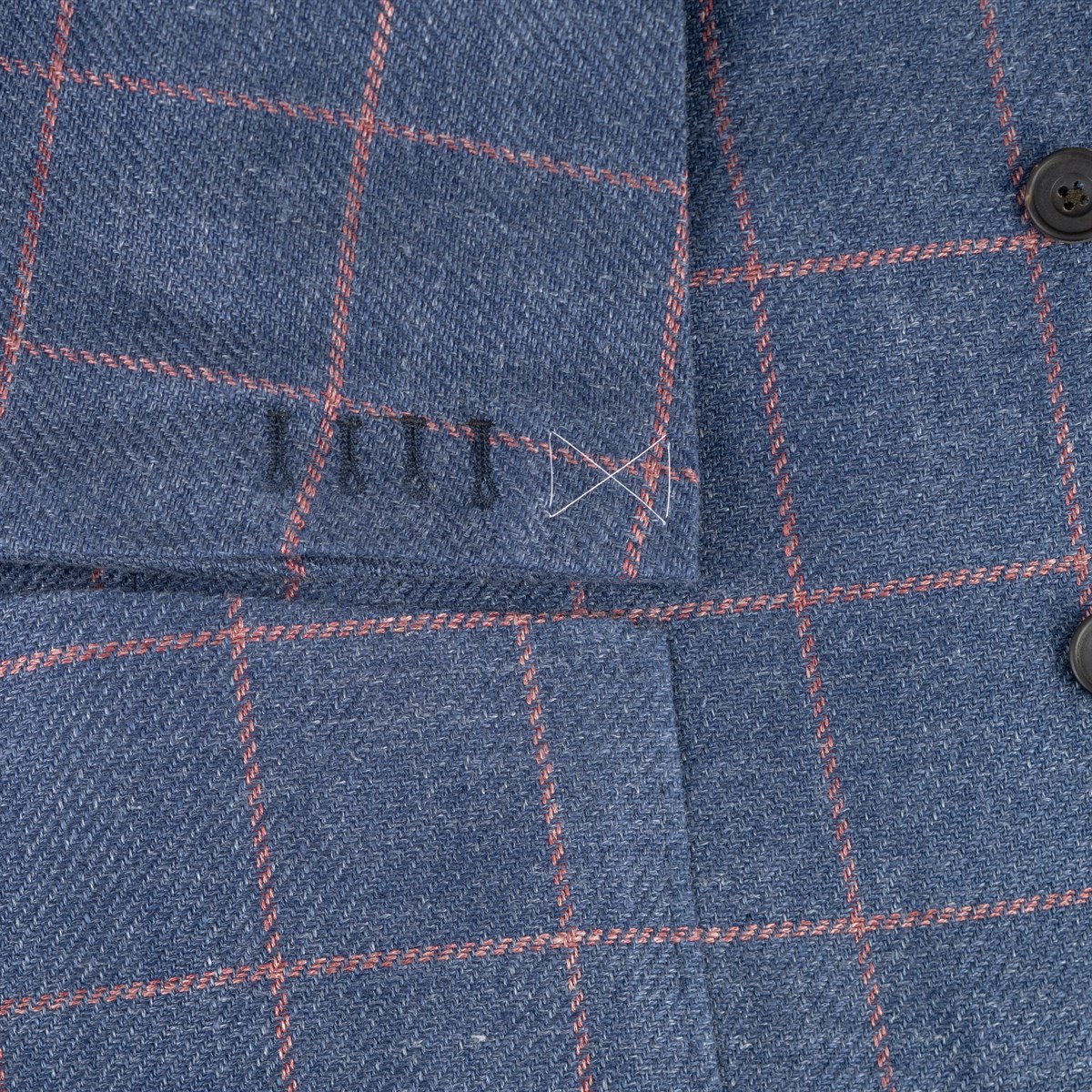 This single-breasted linen-cotton jacket, deconstructed and completely unlined, features a regular fit. The tailored construction is defined by three buttons, pressed to a two-button stance, a classic lapel, patch pockets, and a double vent. The fabric, soft to the touch and crafted from natural fibres, is decorated with intriguing pink checks, making it perfect for the summer season while highlighting the personality and style of the wearer. The contrasting burgundy internal piping, a distinctive hallmark of Maison Rubinacci, emphasizes attention to detail and the careful selection of materials. Perfect for those who appreciate Rubinacci tailoring, where quality of materials and refinement coexist in every stitch. The sleeve buttonholes are left closed to allow for possible length alterations.