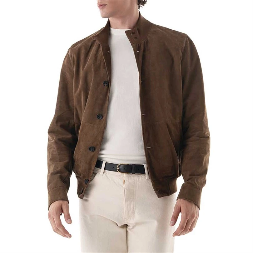 Che sia indossato sopra una maglietta casual o indossato con pantaloni sartoriali, questo capo versatile è perfetto per una vasta gamma di occasioni, dalle gite del fine settimana agli incontri smart-casual. Abbraccia l'eleganza senza tempo ed eleva il tuo guardaroba con il bomber in pelle scamosciata color tabacco, un must per l'uomo moderno.