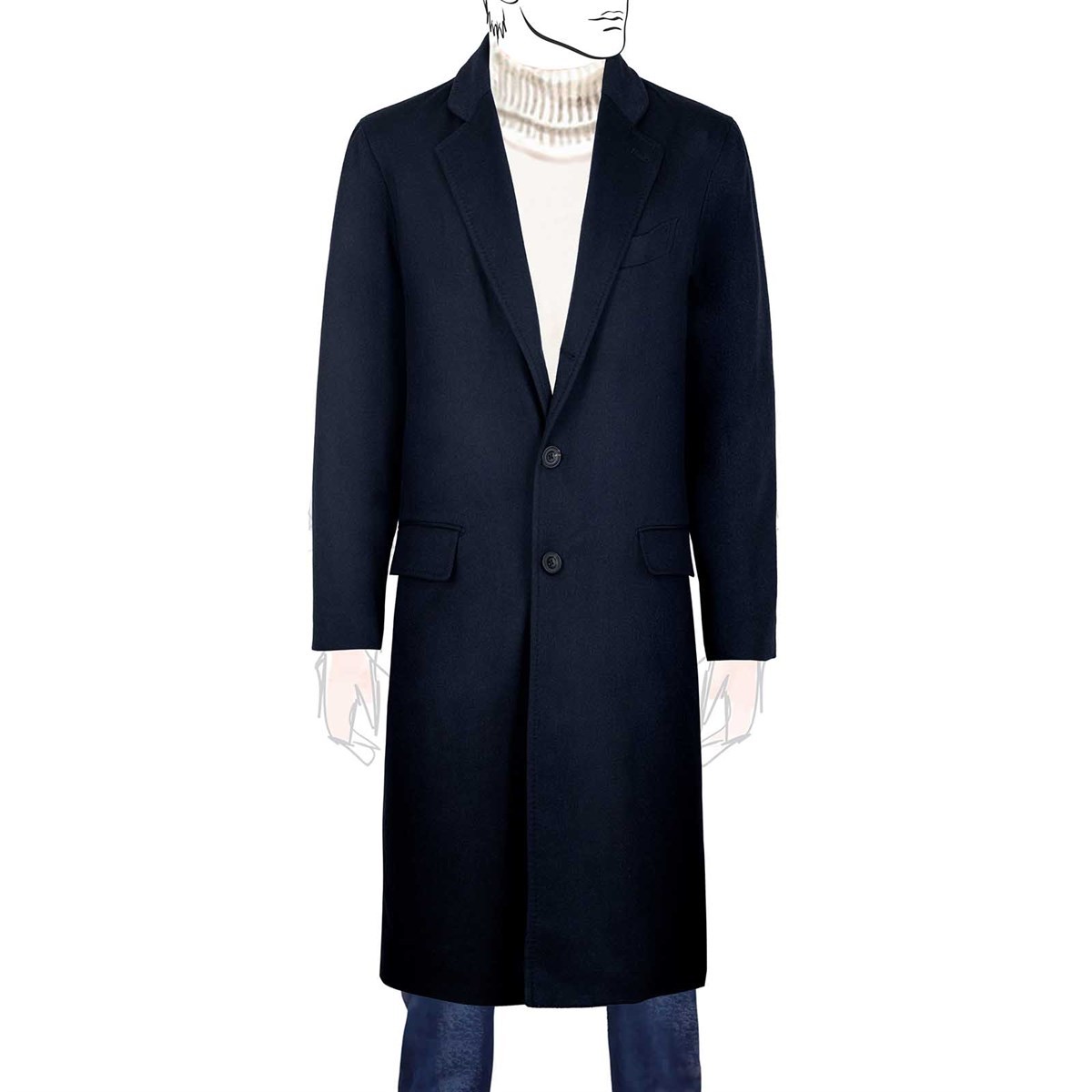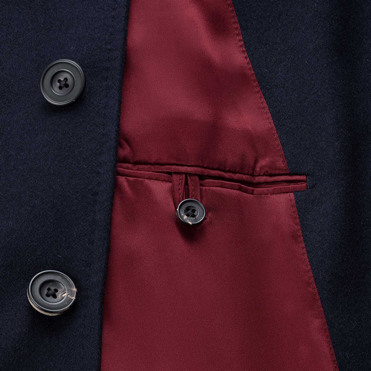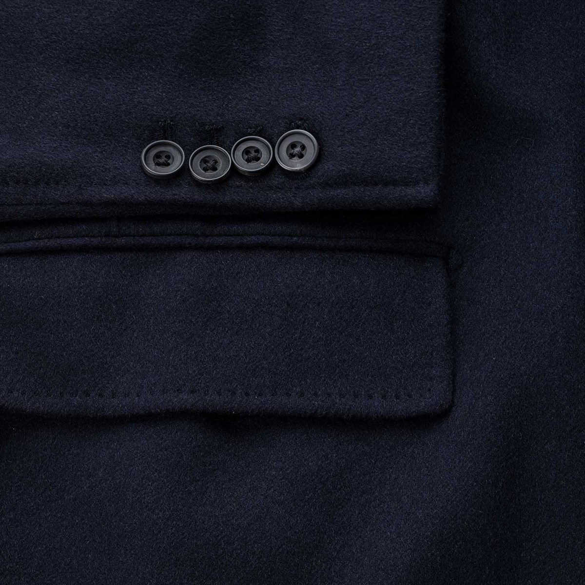 Realizzato in lana skyfall blu, monopetto, 3 bottoni in corno, due tasche con patta, fodera in seta.