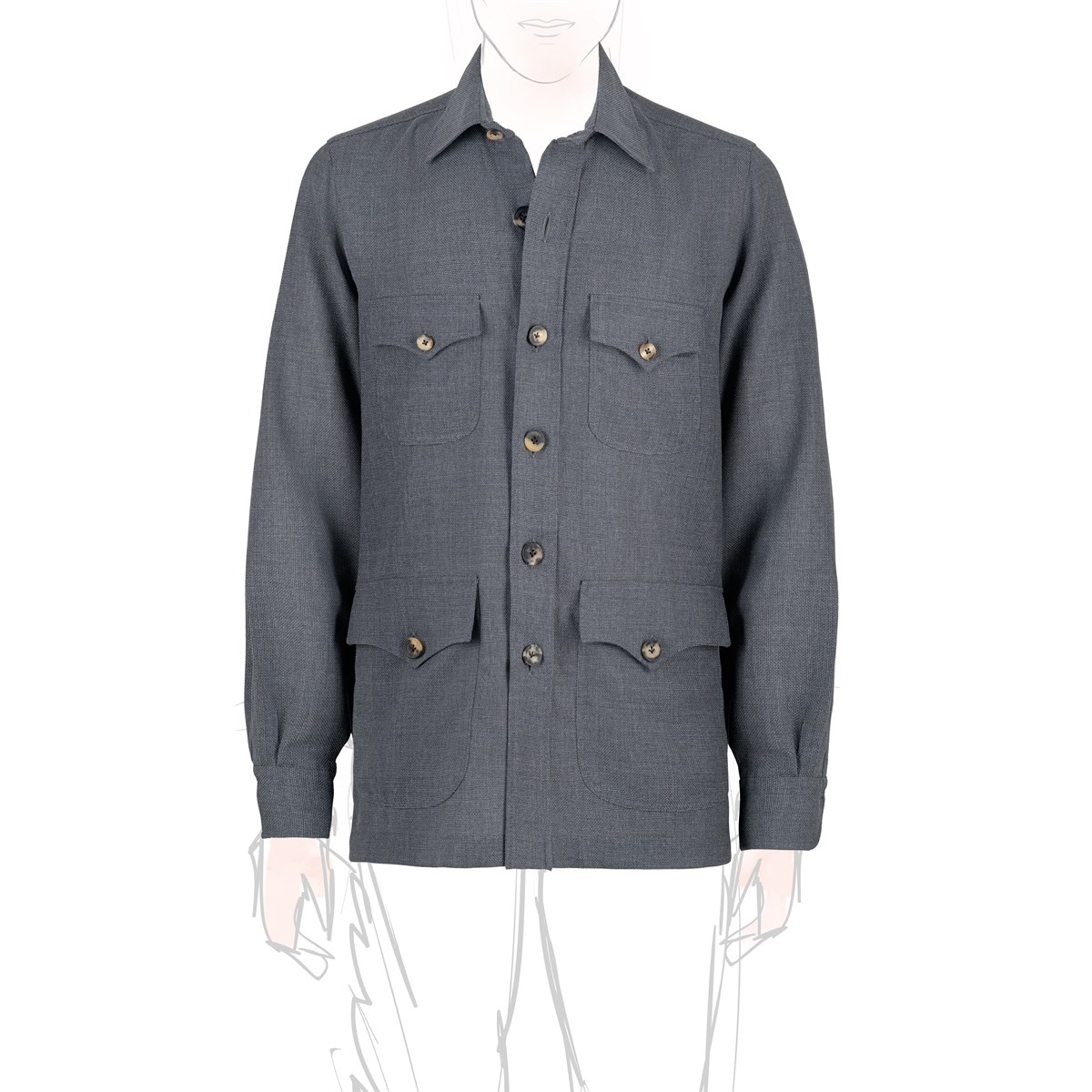 Stile: collo classico, 4 tasche frontali con pattine, bottoni in corno
