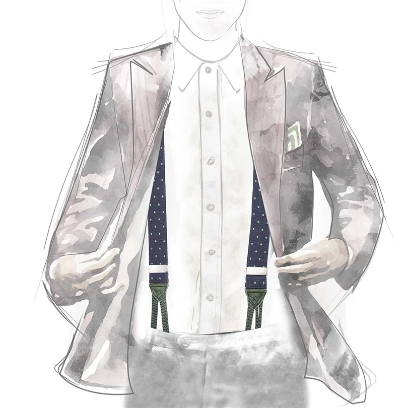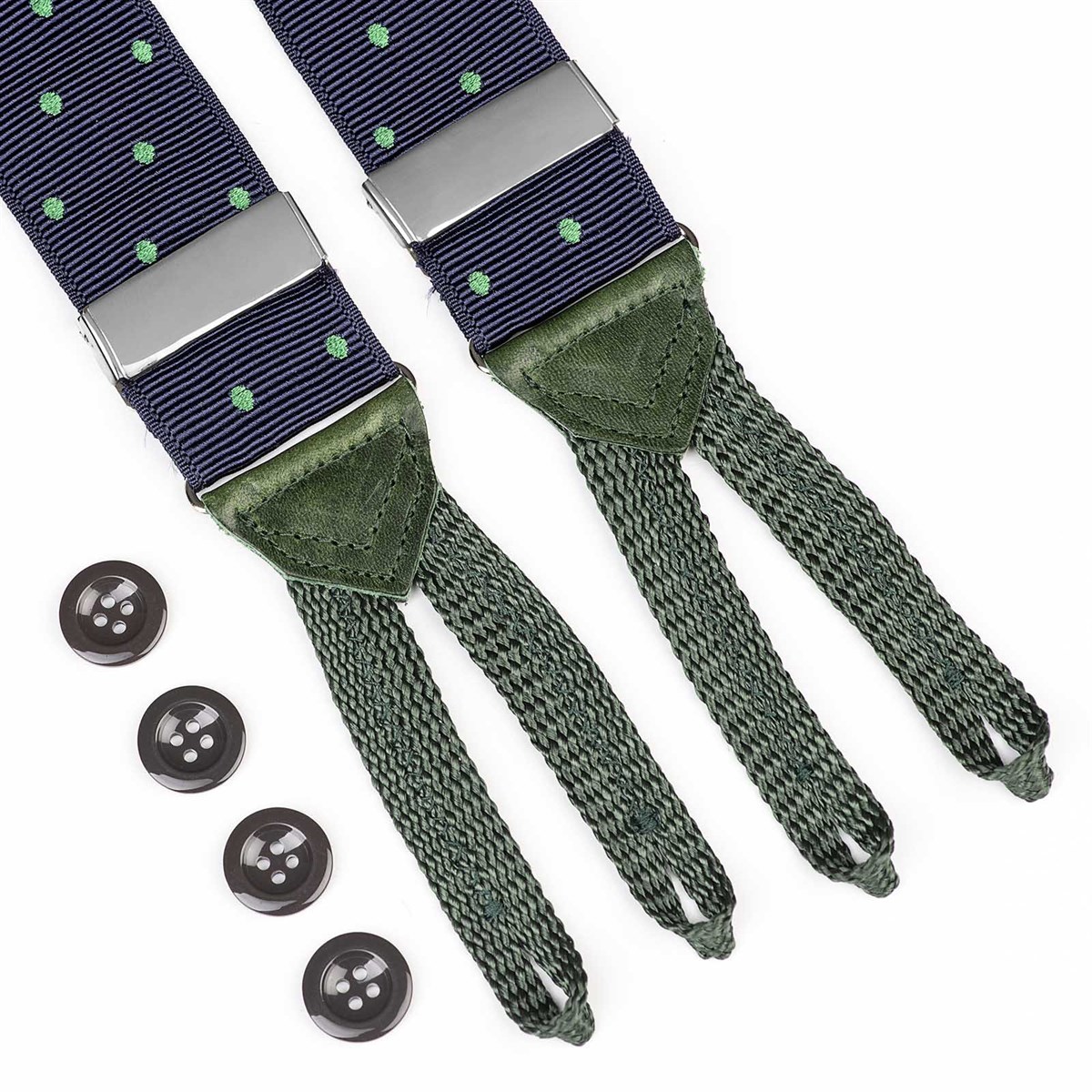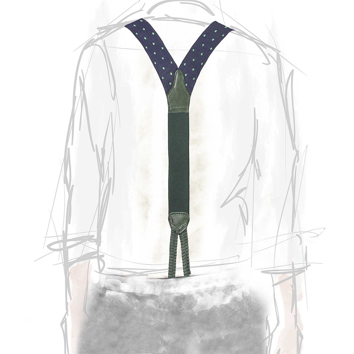 Whether paired with a crisp dress shirt for a polished appearance or worn over a simple tee for a laid-back vibe, these suspenders are the perfect accessory to express your individuality. Adjustable straps ensure a perfect fit, while the durable clips keep your pants securely in place. Embrace the versatility of these suspenders and effortlessly enhance your wardrobe with this unique piece. Make a bold statement and showcase your sense of style with our Blue Suspenders with Green Polka Dots, exclusively at Rubinacci.
