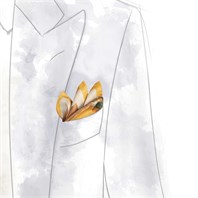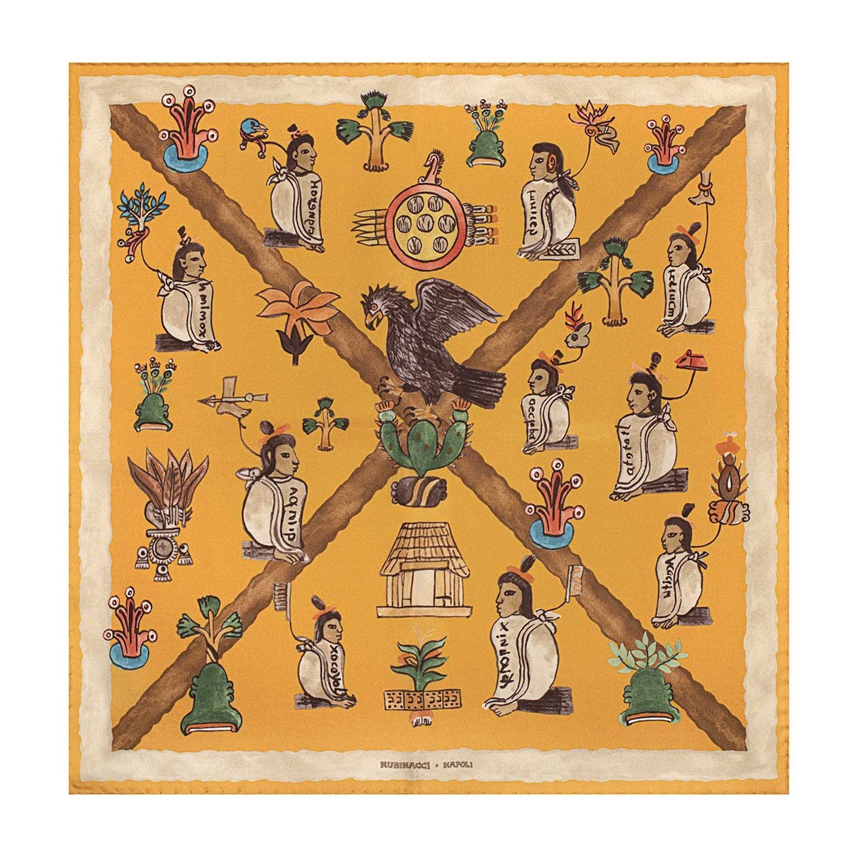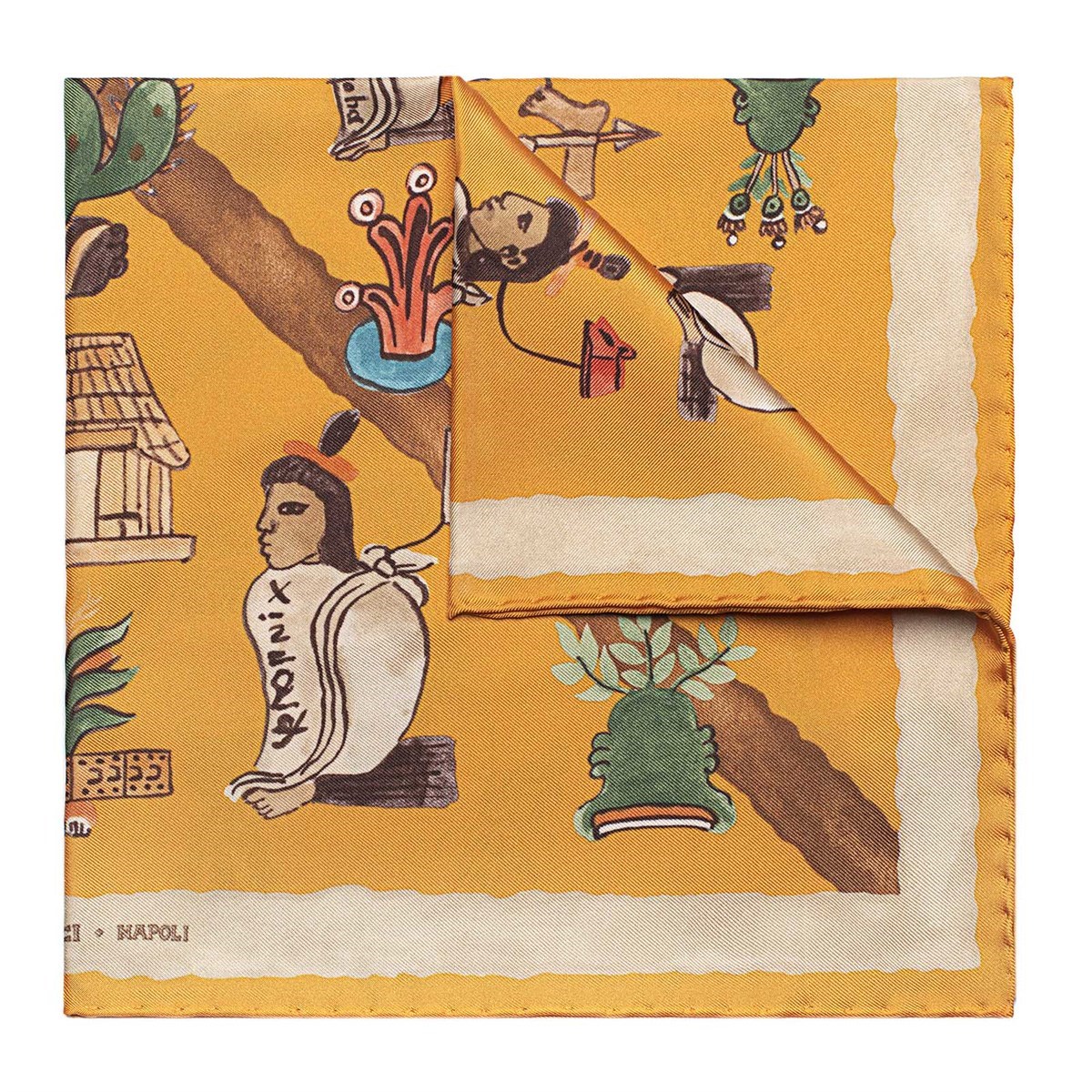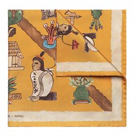 The pocket square features hand-rolled edges, adding a touch of artisanal elegance to its sophisticated aesthetic. Its vibrant ocher hue and intricate pictogram-inspired artwork make it not only a functional item but also a statement piece that sparks conversation and admiration.