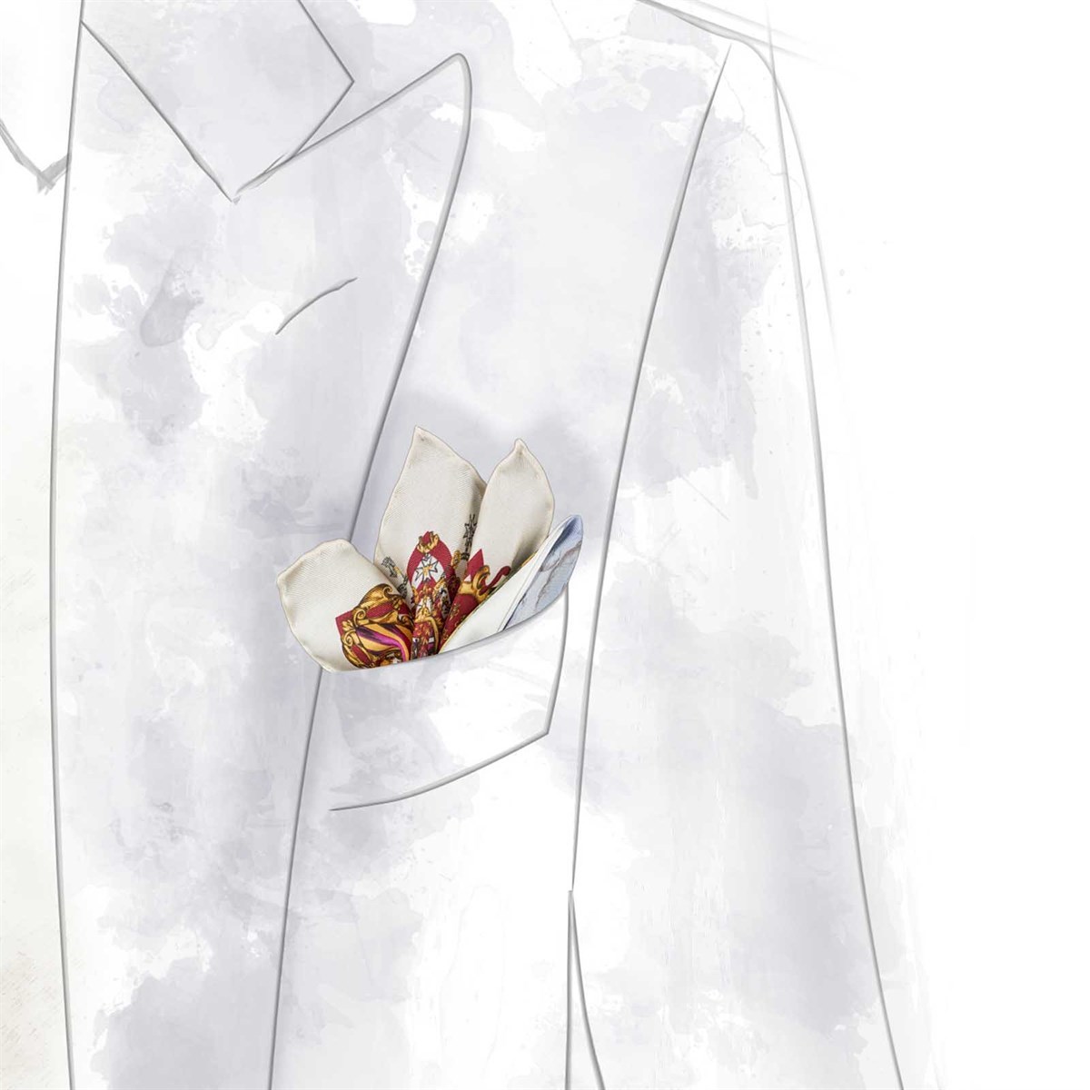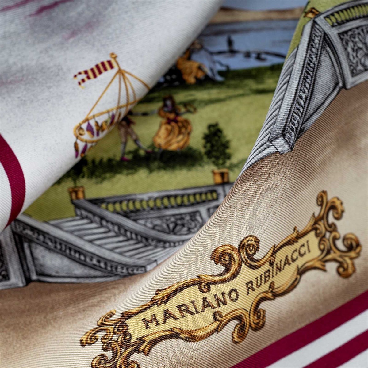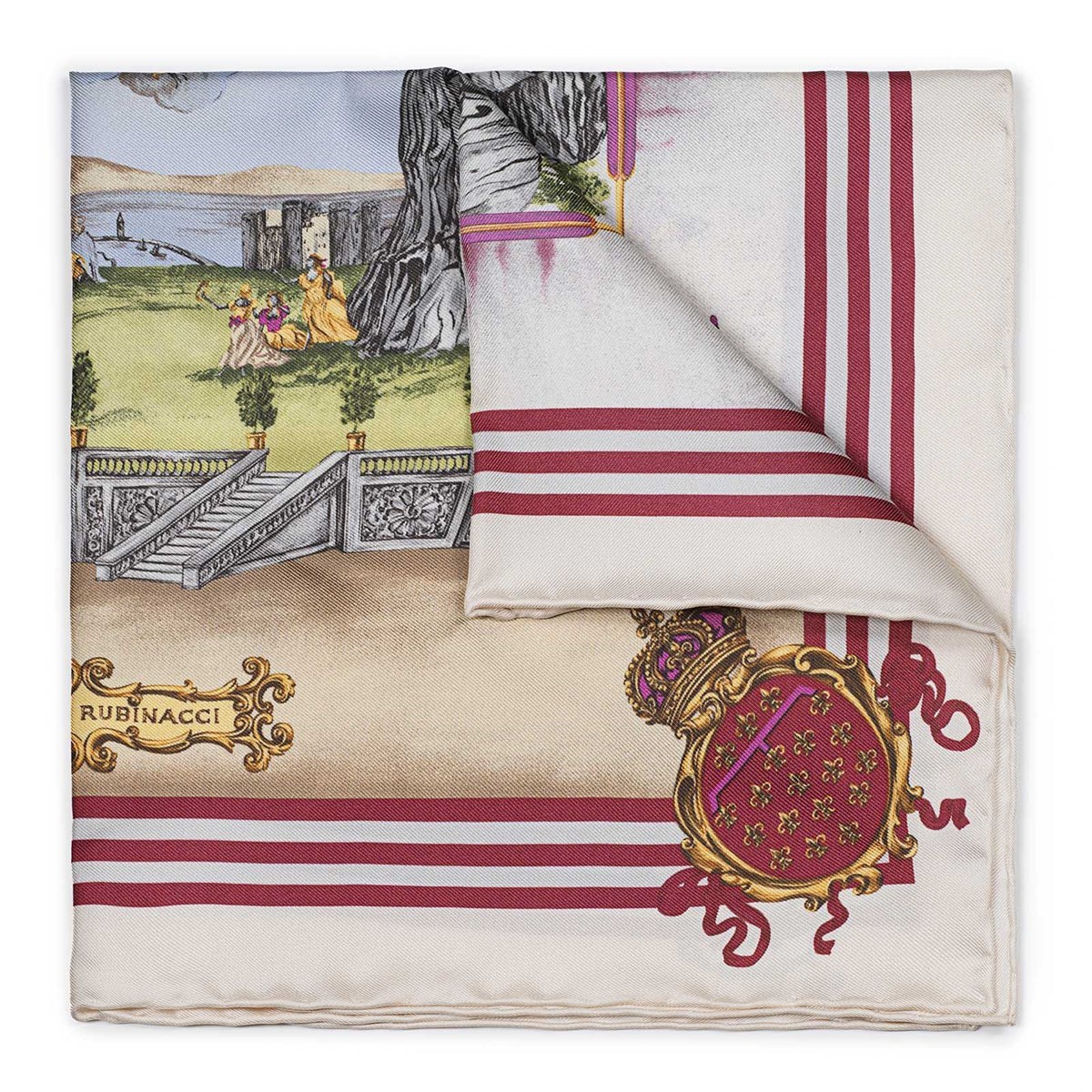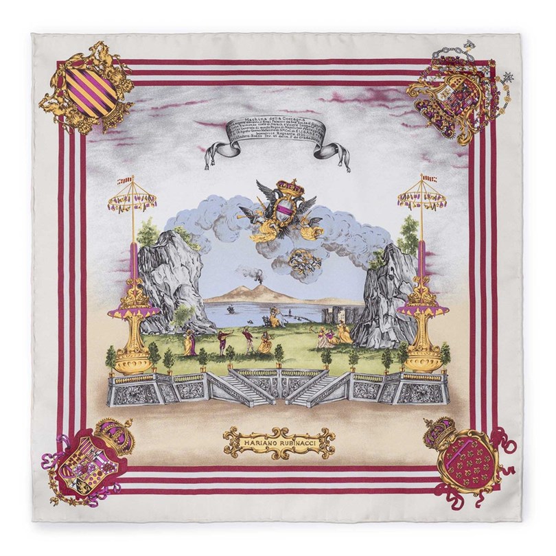 The pochette showcases a stunning design based on a drawing by Cristofor Russo, depicting the magnificent Cockaigne Machine erected in 1740 during the celebrations for the birth of the Infanta Royal. Framed by the iconic silhouette of Mount Vesuvius and adorned with the coats of arms of five prominent Neapolitan families, this accessory serves as a wearable piece of history.