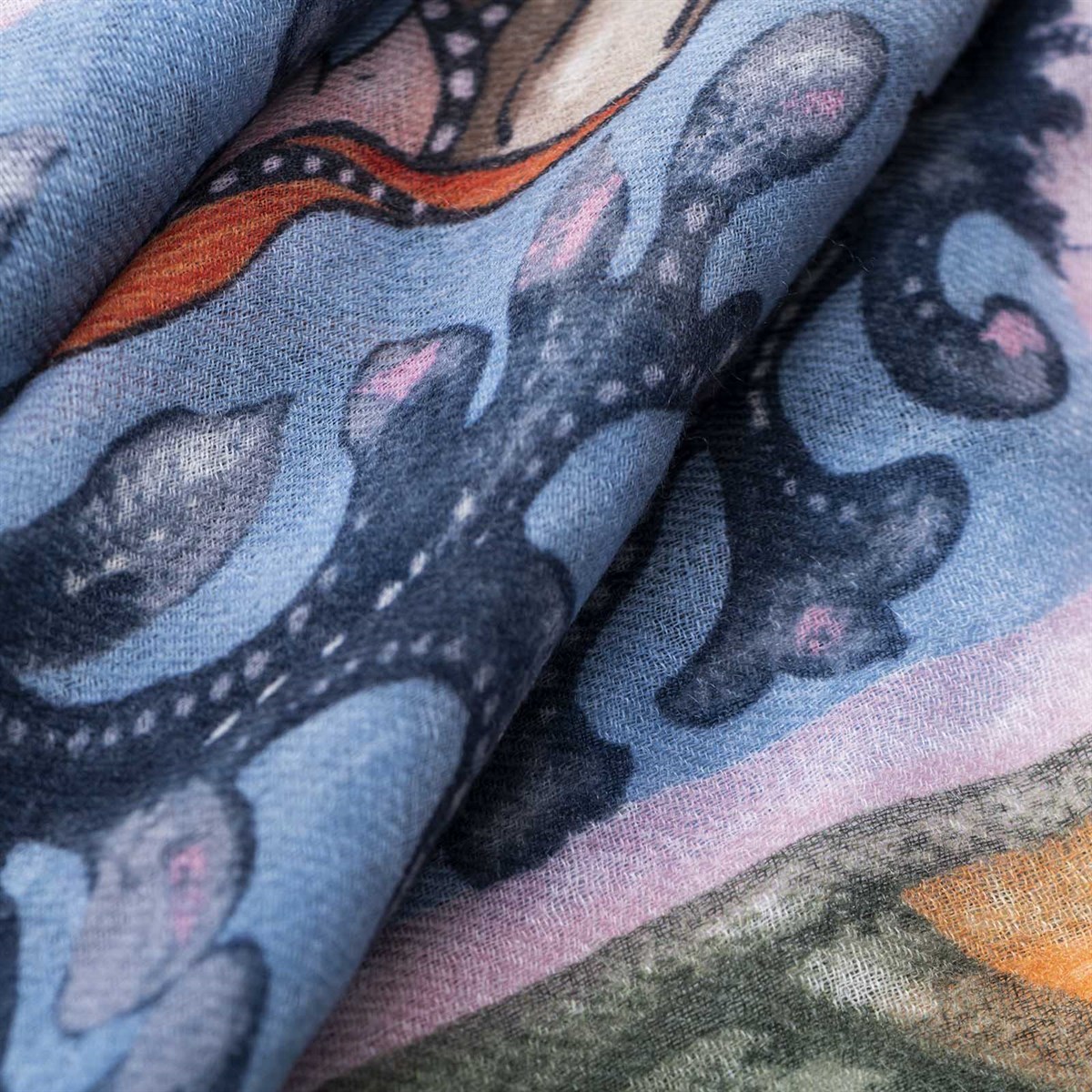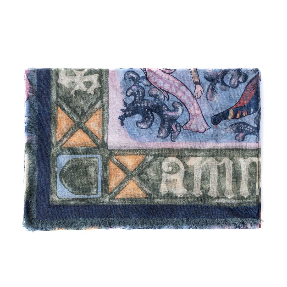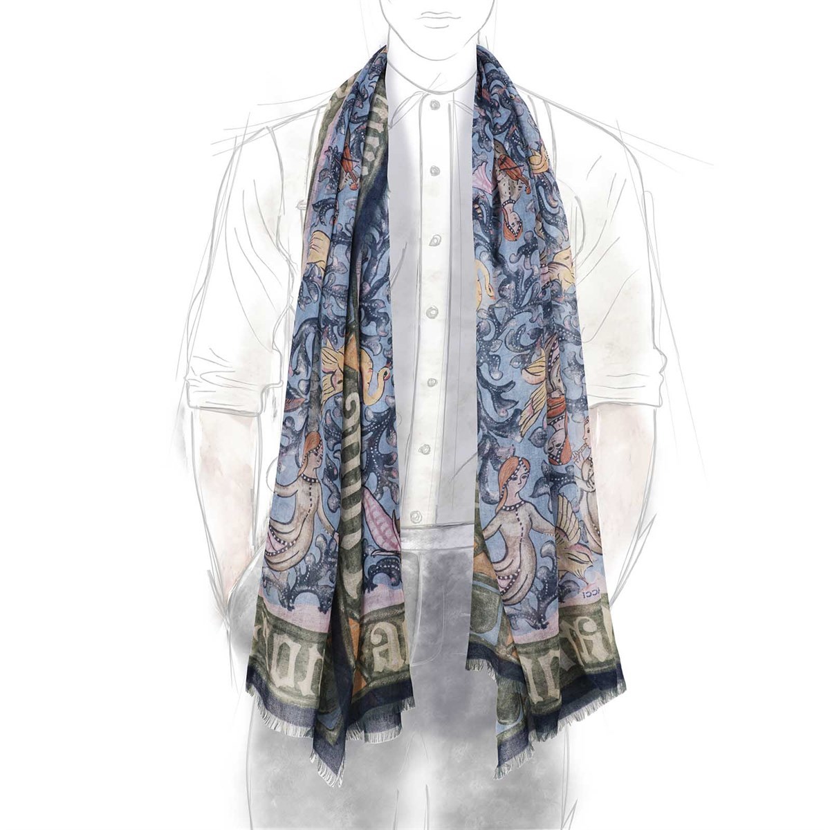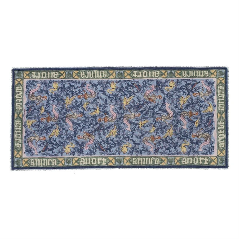 Embellished with images of Sirens playing the mandolin, the scarf symbolizes the idolization of the beloved, reflecting the ideals of noble and gallant hearts that characterize "Courteous Love." The design is further enriched with whimsical representations of racemi, birds, various mammals, and mermaids, creating a vibrant tapestry of romance and nature.