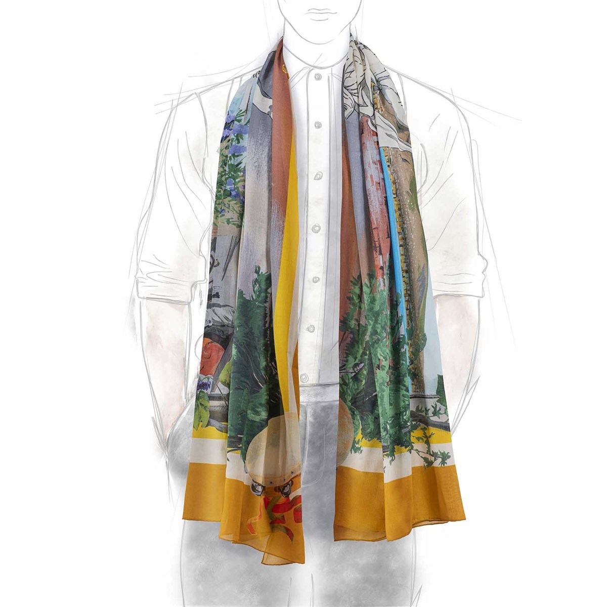 Part of the exclusive Maison Rubinacci collection, this stole is not just an accessory but a statement piece that reflects your appreciation for art and culture. Elevate your wardrobe with the Ocher Tarantella Stole and celebrate the joy of movement and tradition wherever you go.