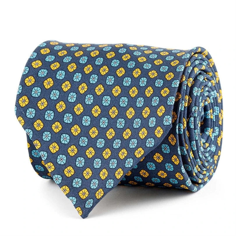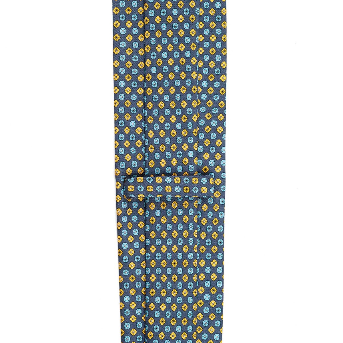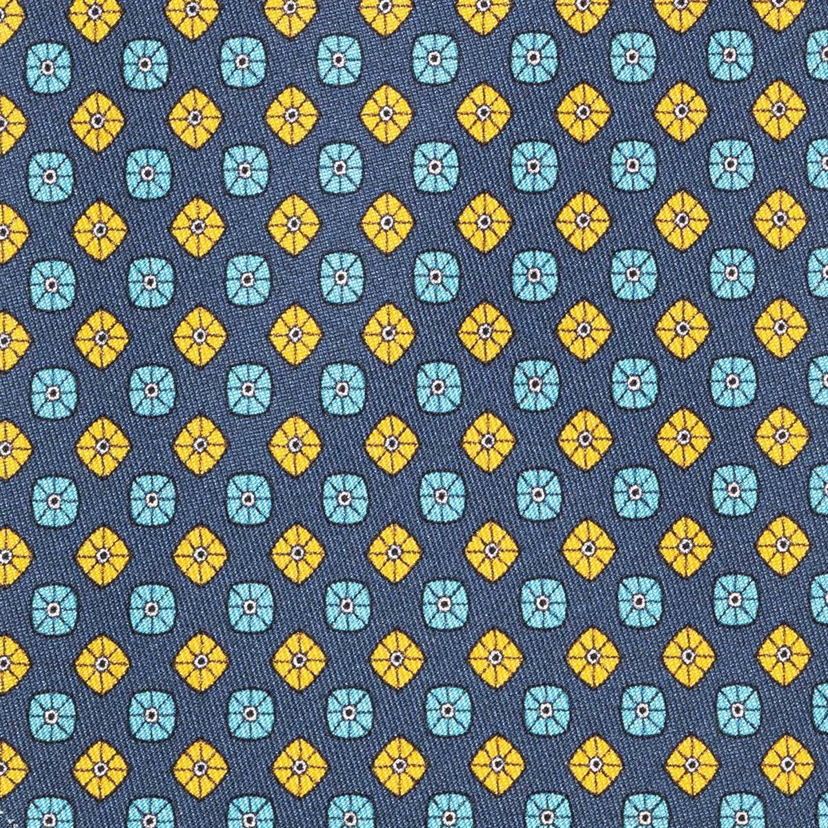 Crafted from fine silk twill, this blue tie with a geometric print stands out for its soft texture and the brilliance of its color, adding vibrancy and refinement to any look. The geometric pattern, modern and sophisticated, reinterprets a classic accessory in a contemporary way, making it perfect for both formal and informal occasions.