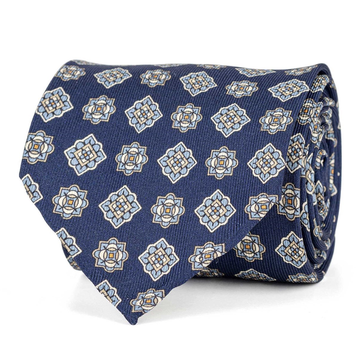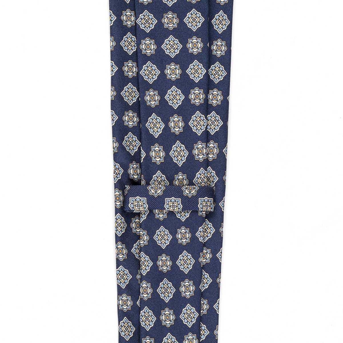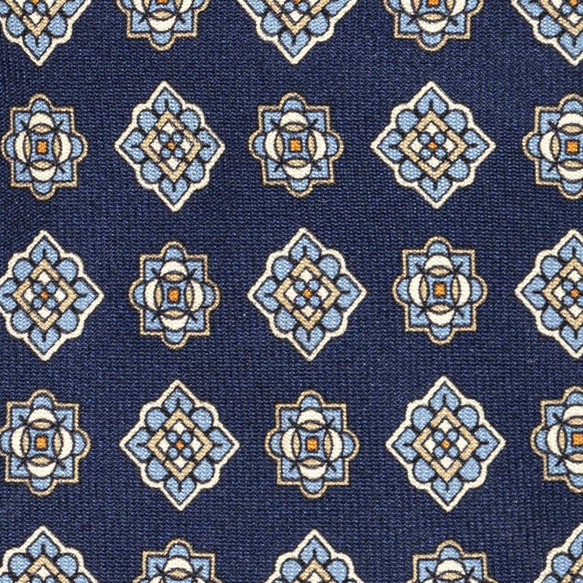 Blue silk twill tie with geometric print