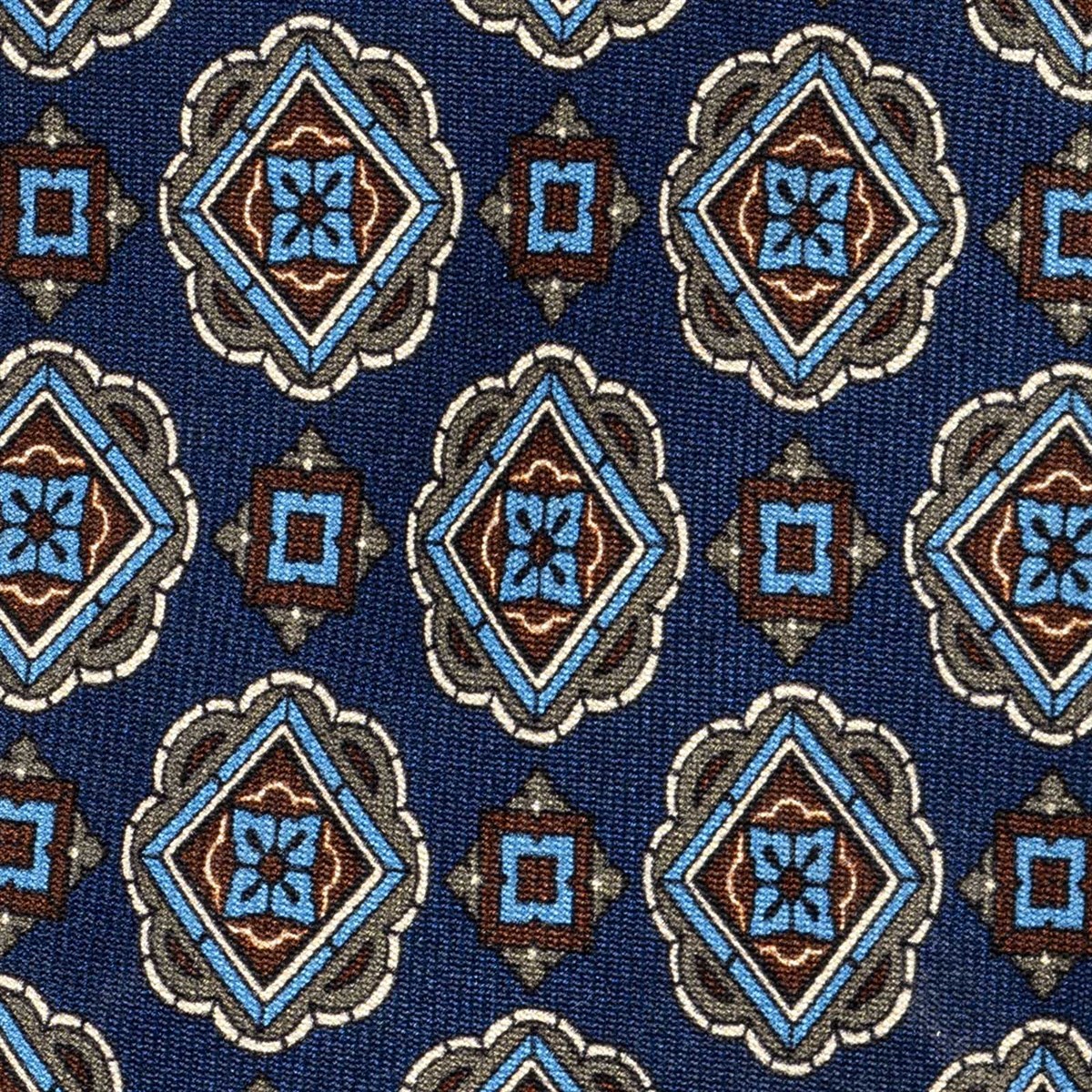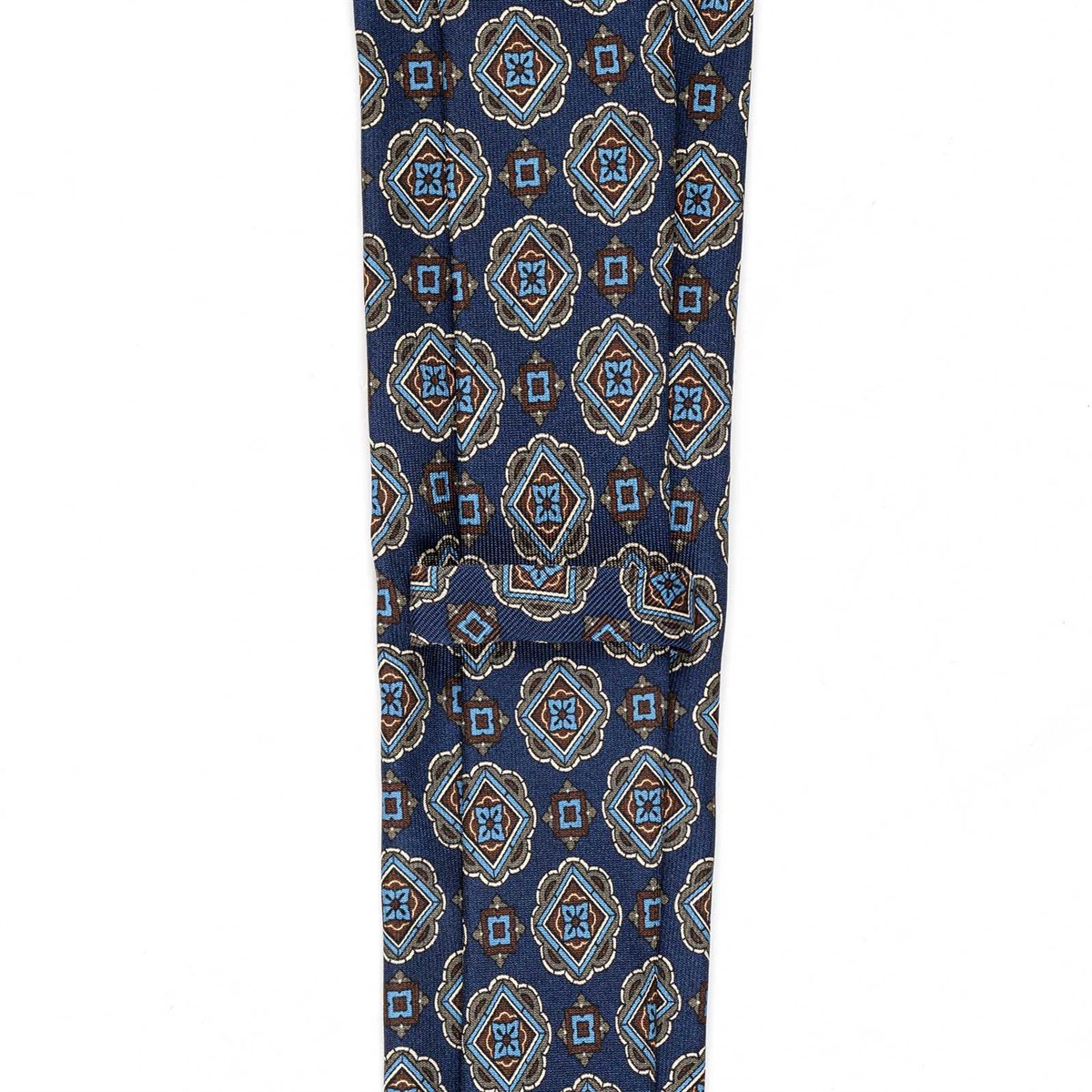 Blue silk twill tie with geometric print
