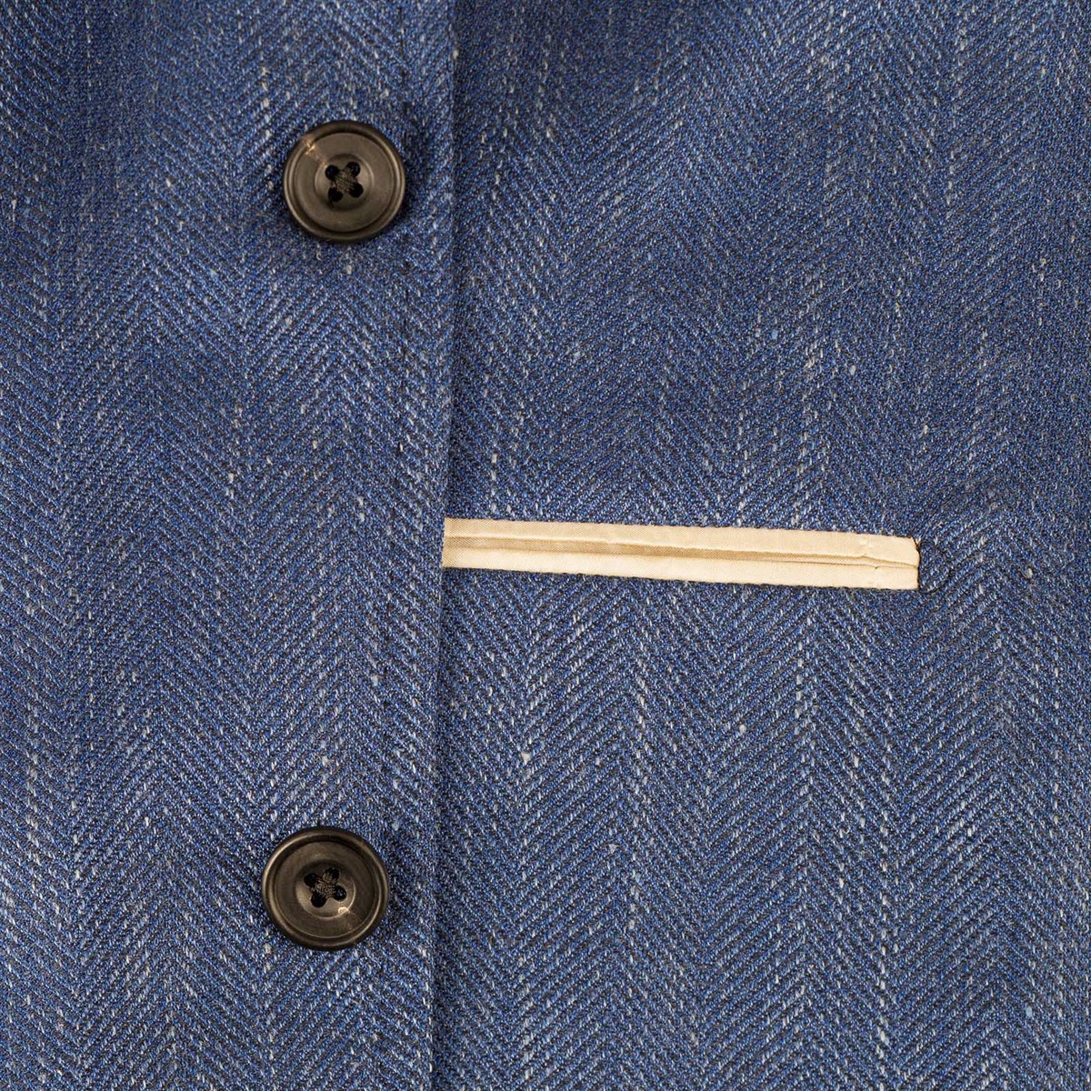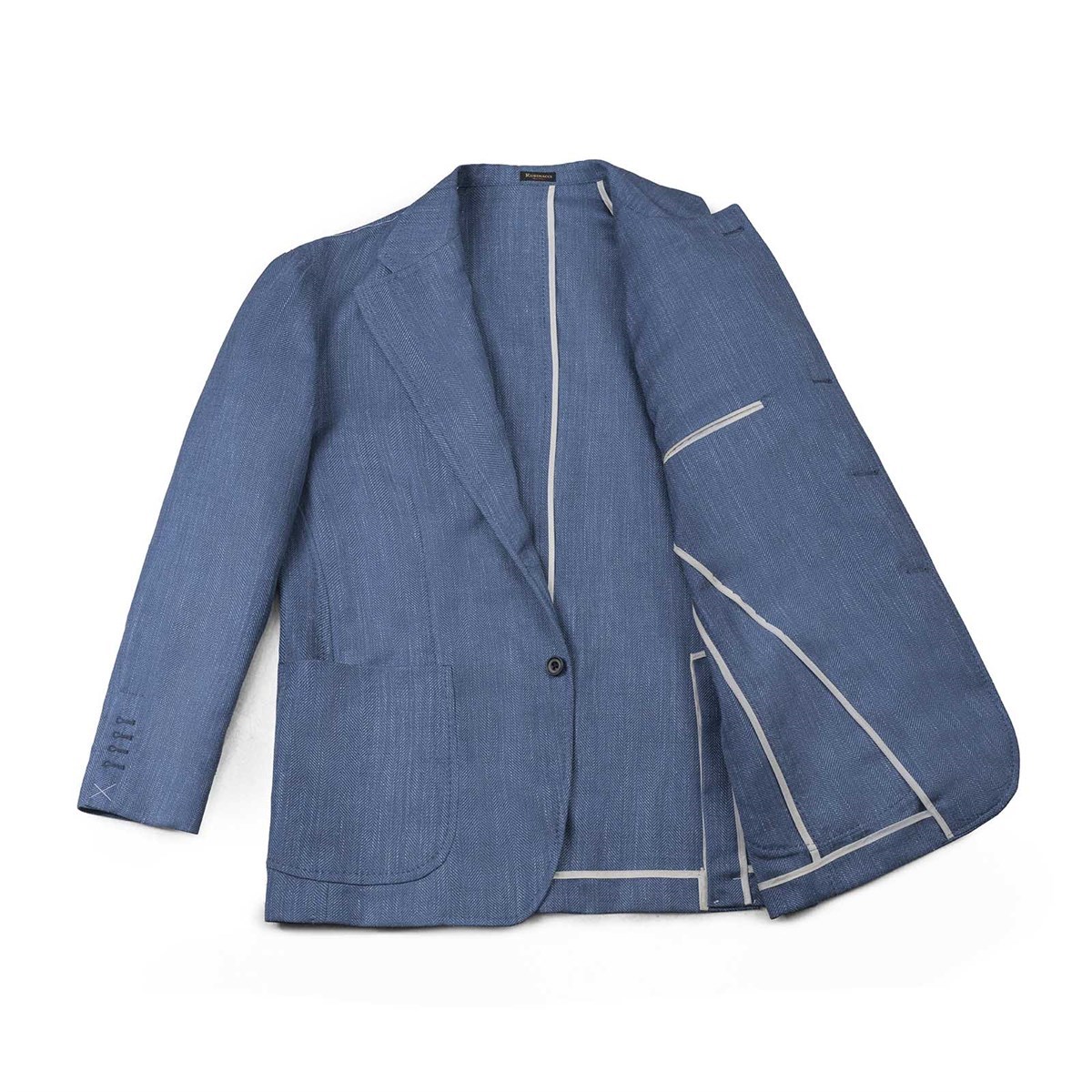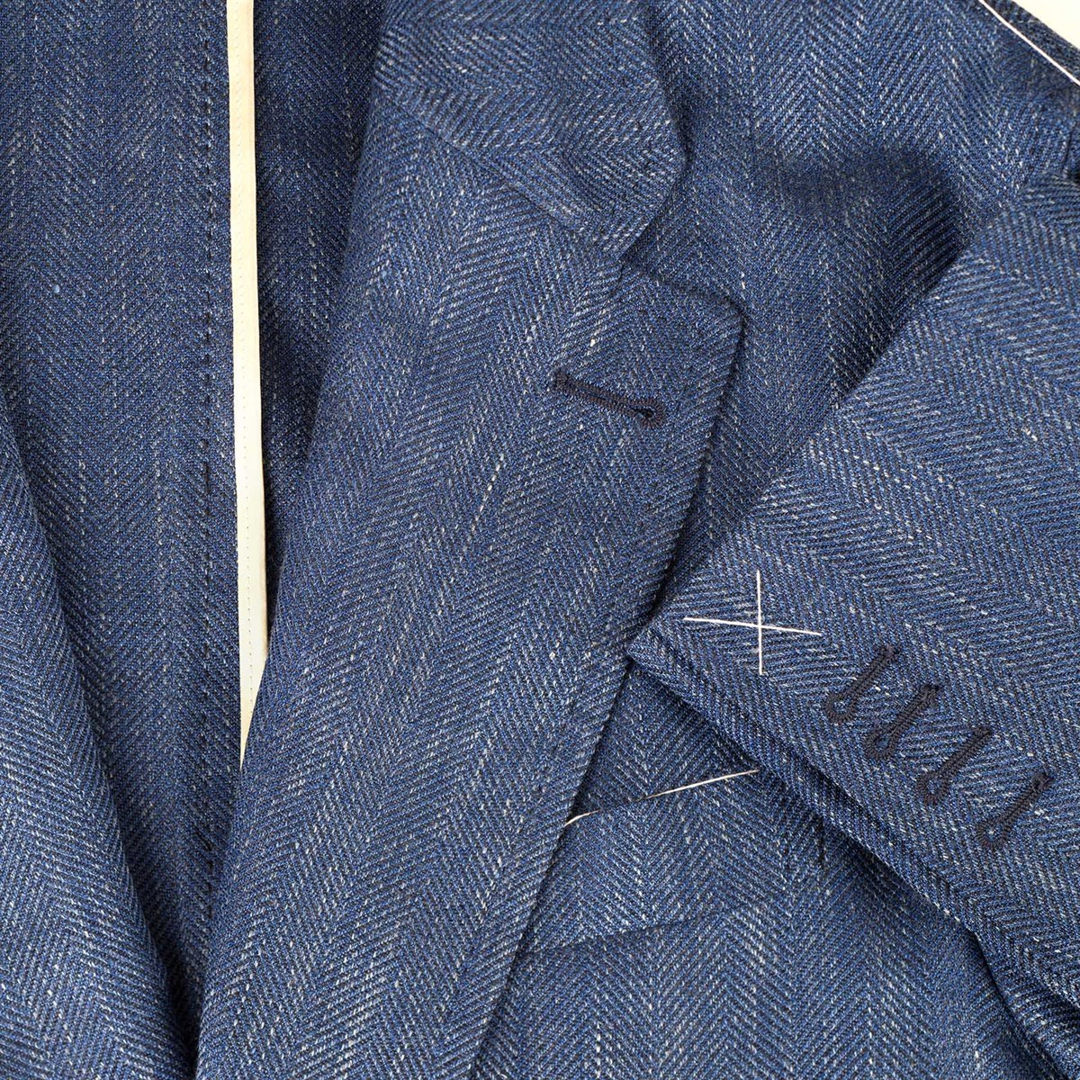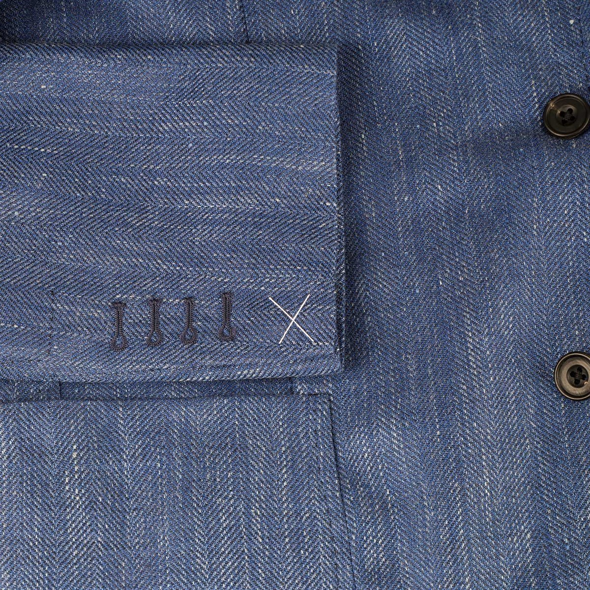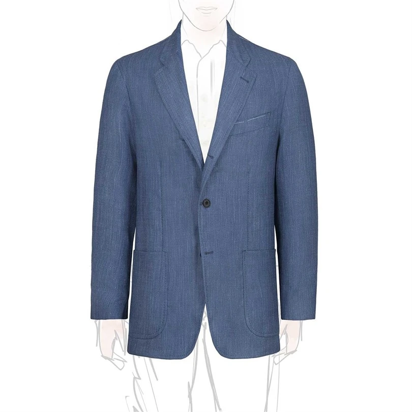 Designed with a single-breasted silhouette, this jacket features three elegant pressed horn buttons and two functional patch pockets, providing both style and practicality. Its completely unlined construction enhances breathability, making it an ideal choice for warmer seasons or layered looks. The unique herringbone pattern adds a touch of sophistication, while the bold blue hue ensures you stand out in any setting.