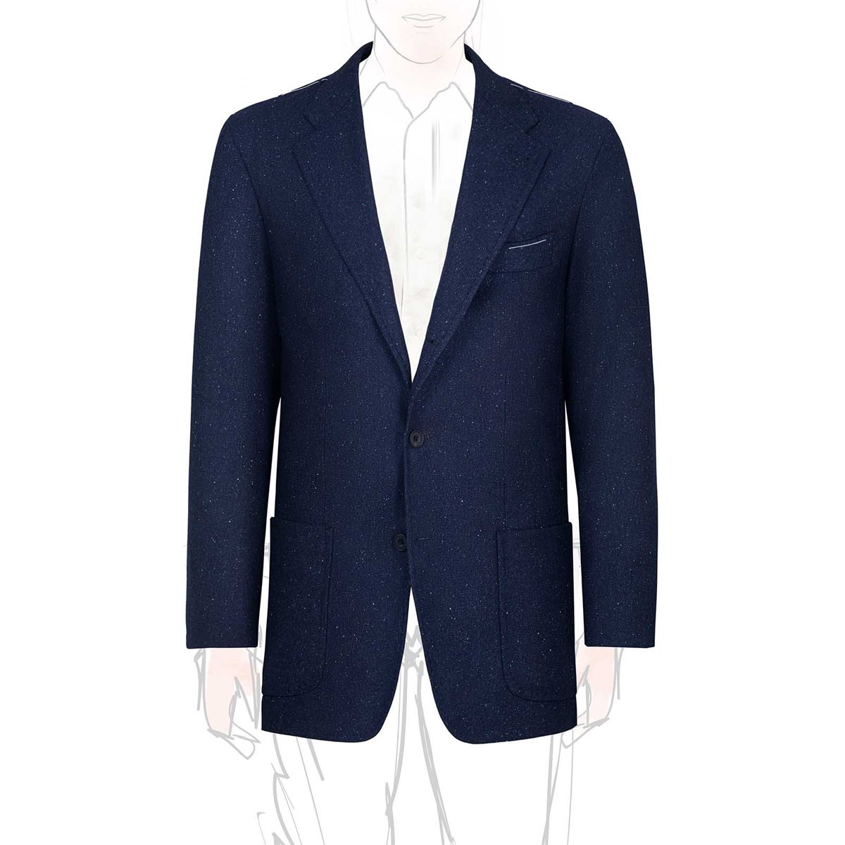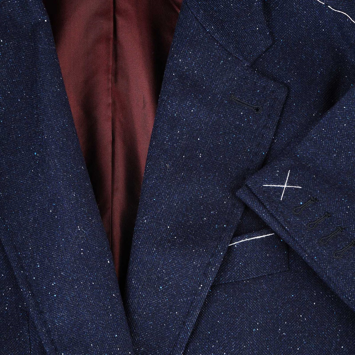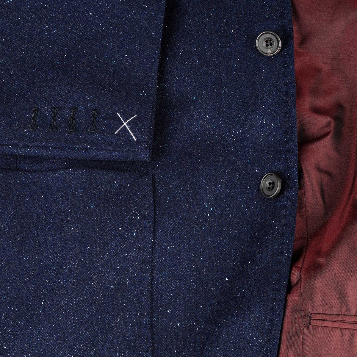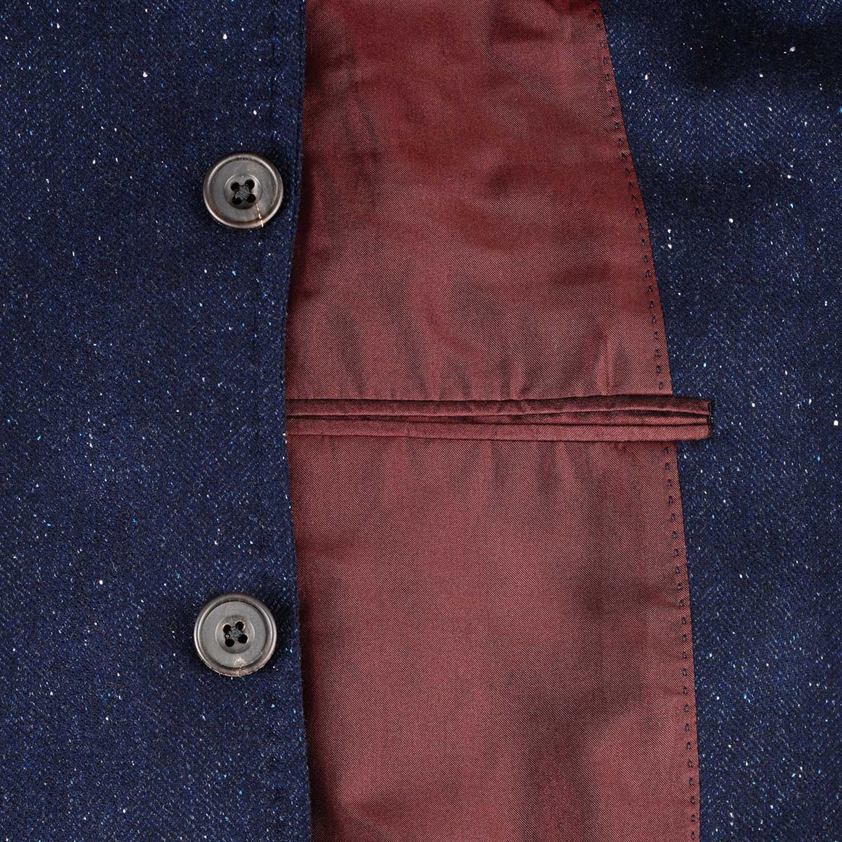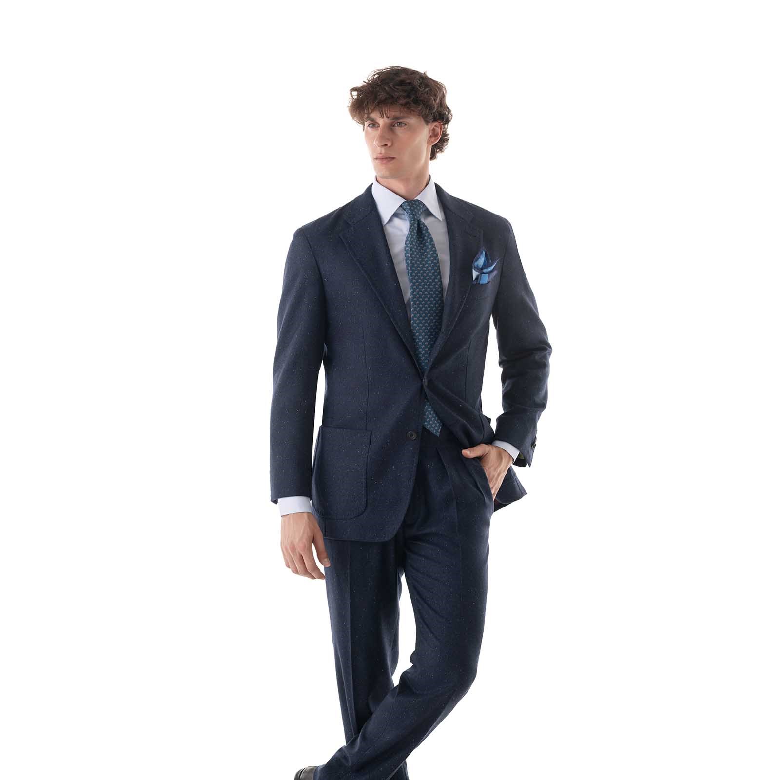 Characterized by a clean line and a regular fit, the three-roll-two jacket is fully lined and features a classic lapel, patch pockets, and a chest pocket, for an essential yet sophisticated aesthetic. The internal sartorial details, such as hand-finished seams and the contrasting bordeaux-colored piping, testify to the unmistakable artisanal mastery of Maison Rubinacci. The sleeve buttonholes are closed in case sleeve length adjustments are needed.