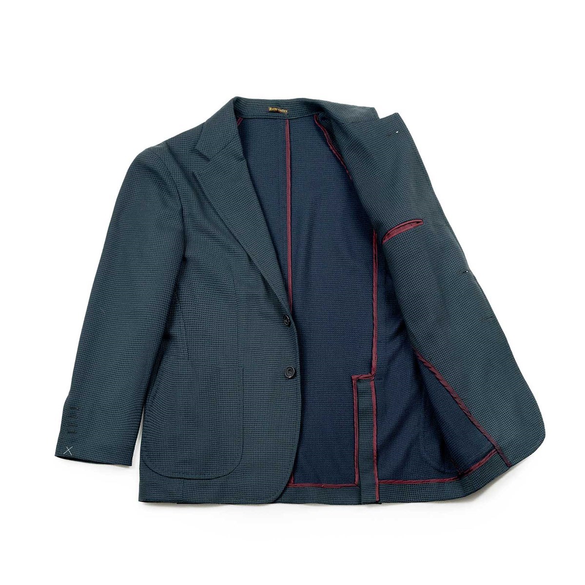 Characterized by a clean line and a regular fit, this three-roll-two jacket, is completely unlined and features a classic lapel, patch pockets, and a chest pocket, for an essential yet refined aesthetic. The internal sartorial details, such as hand-finished seams and the contrasting bordeaux-colored piping, testify to the unmistakable artisanal mastery of Maison Rubinacci. Its soft construction enhances the fluidity and lightness of Super 130’s wool, ensuring comfort, breathability, and freedom of movement without sacrificing impeccable elegance. Perfect for those seeking casual elegance with a sophisticated allure, ideal to pair with tailored garments or more informal looks. The sleeve buttonholes are closed to allow possible length adjustments.