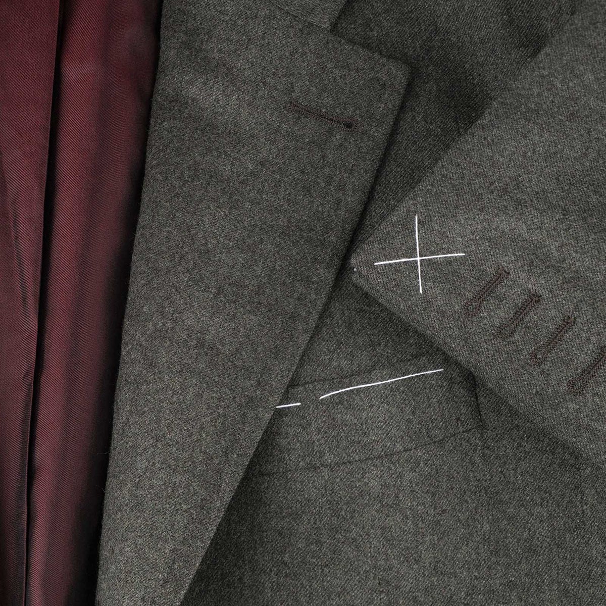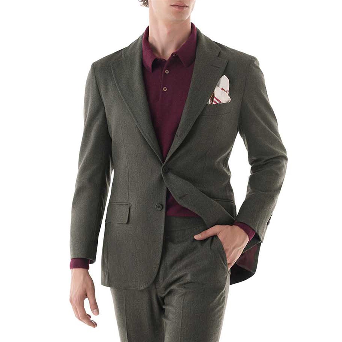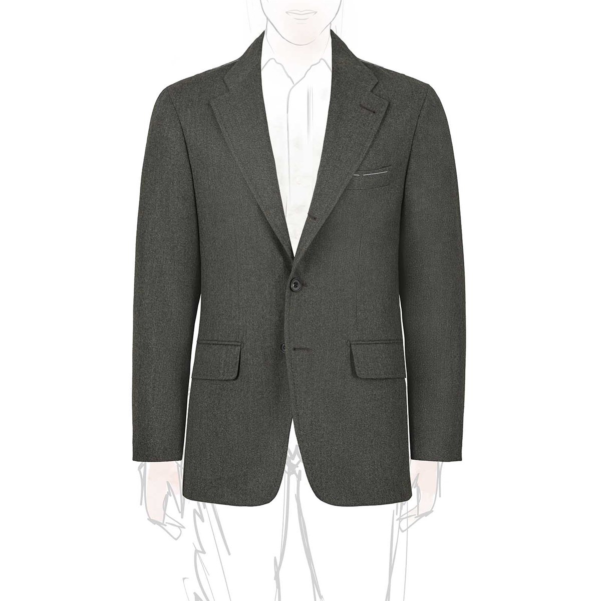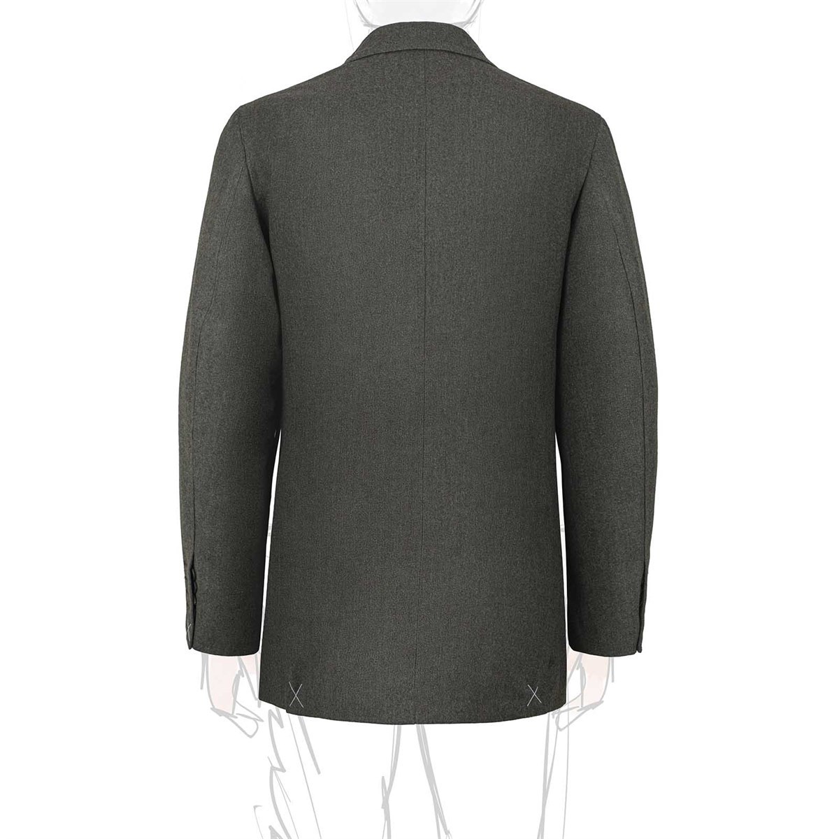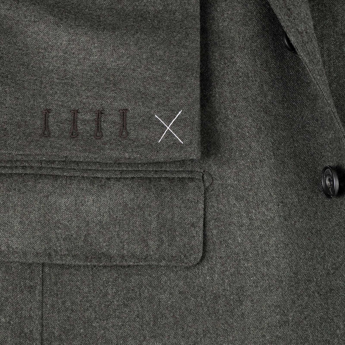 Notch lapels. Buttonhole on the left lapel. Six buttons silhouette. Cuffs with four working horn buttons. Left chest welt pocket. Two front waist flap pockets. Two interior breast pockets. Double vents.
