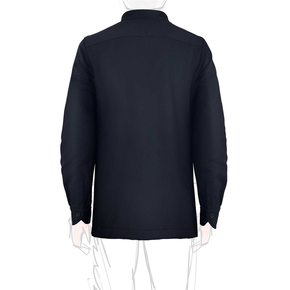 Style: guru collar, 3 front pockets without flaps, horn buttons
