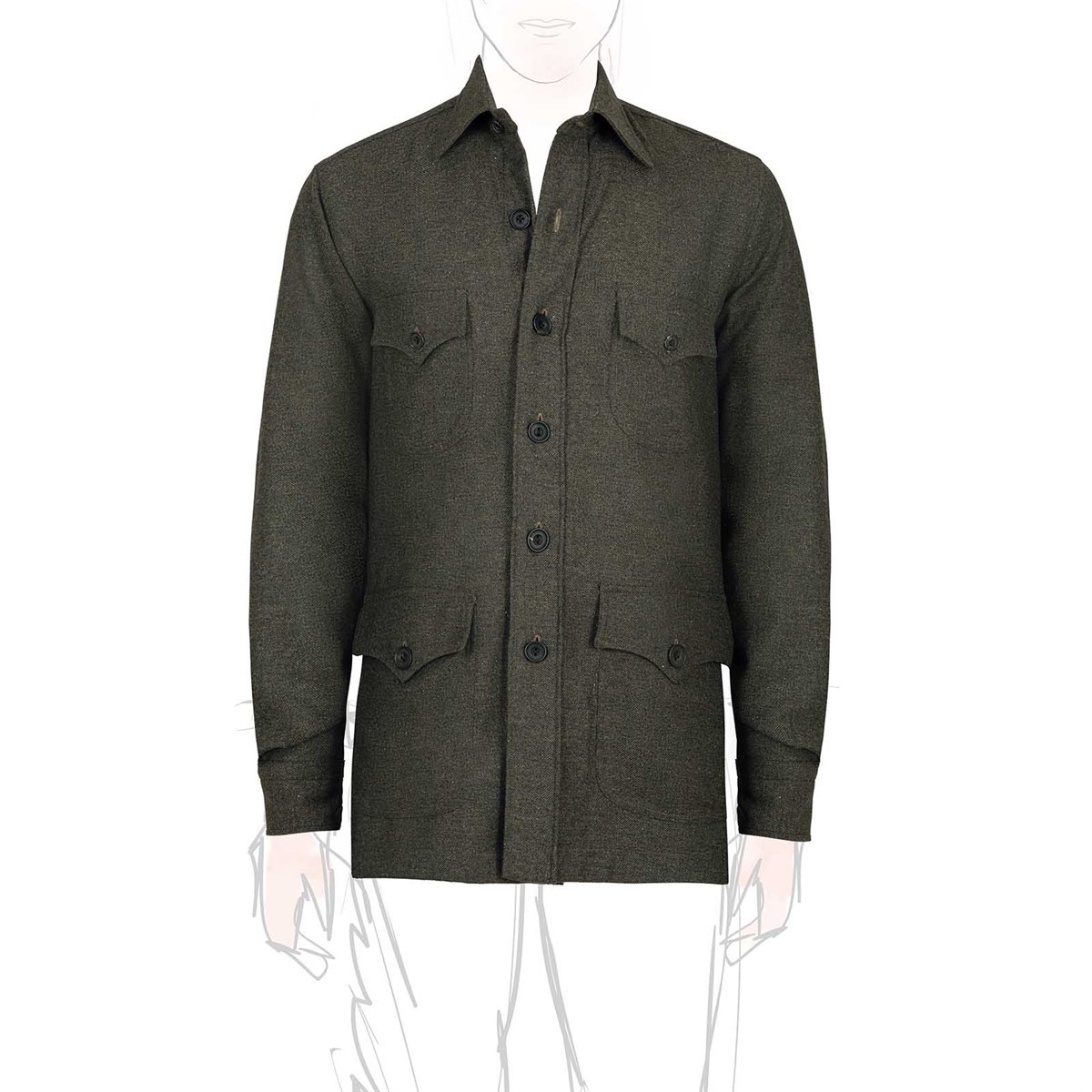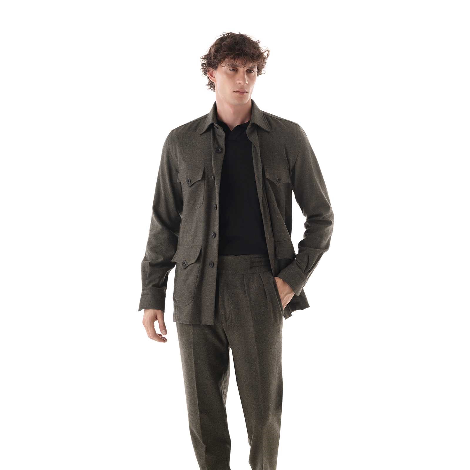 The design is defined by a clean, well-balanced cut, featuring four applied front pockets and two internal ones that preserve an essential and functional aesthetic. The classic collar completes the piece with a touch of formal balance, making it suitable both for refined casual looks and more elegant combinations. A safari jacket with a practical spirit yet refined down to the smallest details, it merges Rubinacci’s sartorial tradition with everyday functionality. Long appreciated for its versatility, it can be worn as a light outer layer during transitional seasons or over a sweater in colder months, offering a sophisticated alternative to the jacket.