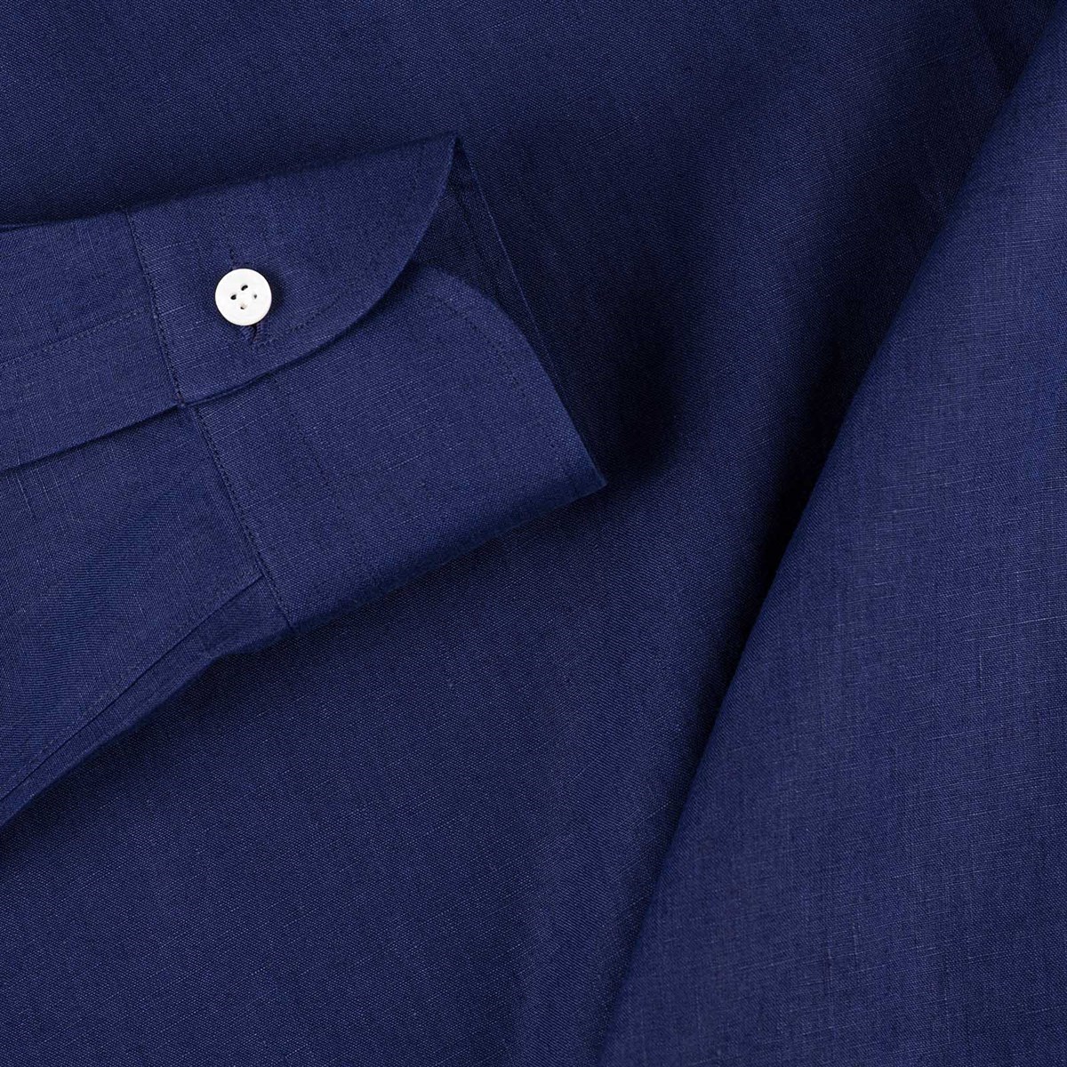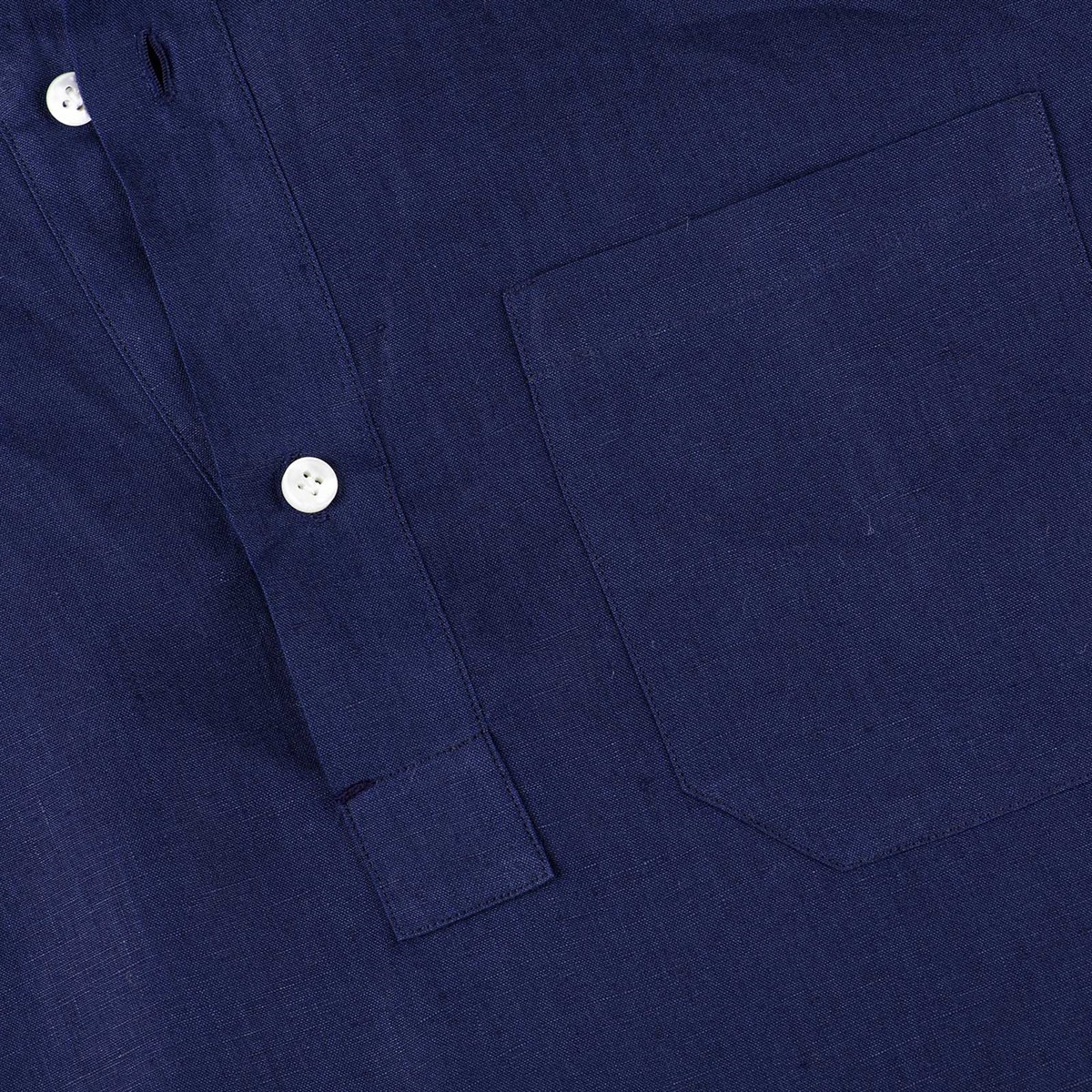 The Bluette Linen Polo Shirt features a classic collar and expertly hand-sewn details, including a delicate mouche at the shoulder and armhole for added sophistication. The hand-embroidered tack and buttonhole, paired with luxurious mother-of-pearl buttons, elevate this shirt to a new level of refinement.
