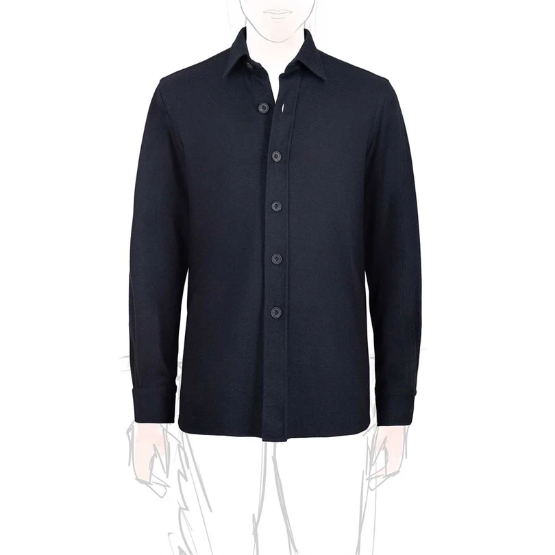 Style: long sleeves with cuffs, classic collar, front closure with horn buttons