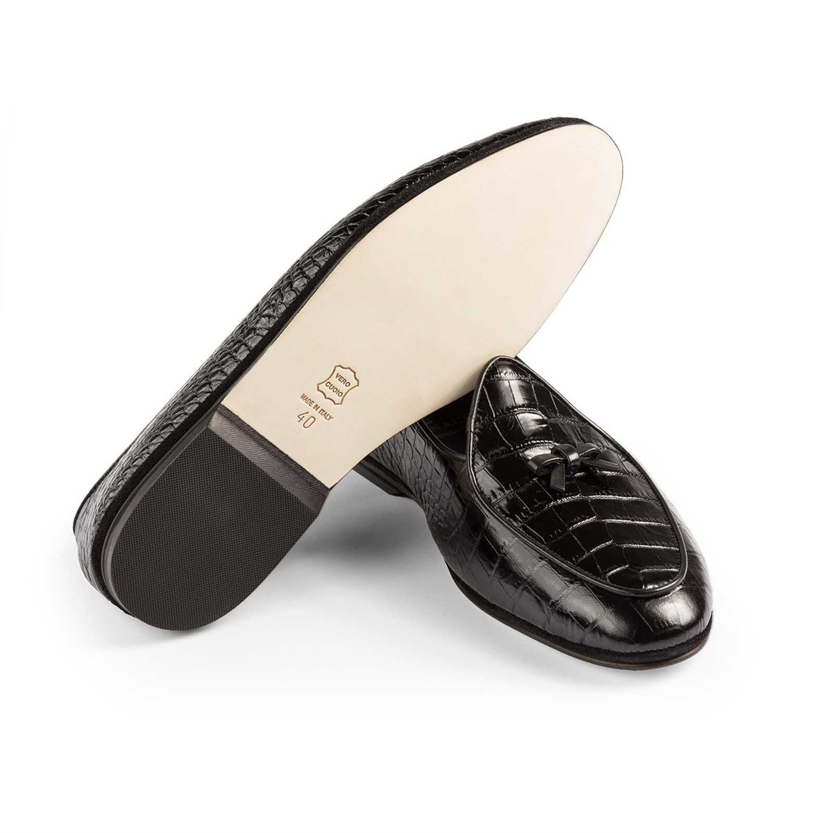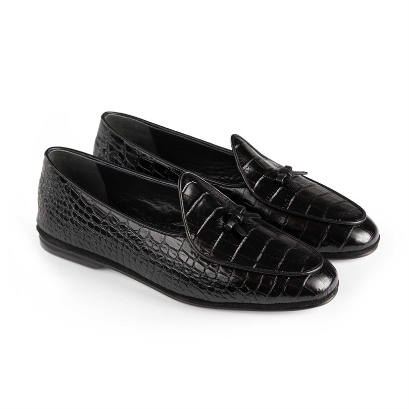 These moccasins are more than just footwear; they are a testament to craftsmanship and attention to detail. With a soft, slipper-like feel, they offer the ultimate comfort for all-day wear, making them perfect for both casual outings and more refined occasions. The collection features a diverse range of high-quality leathers and limited-edition fabrics, ensuring that each pair is unique and special. Step into luxury and experience the perfect blend of style and comfort with the Marphy Loira Crocco Printed Black Moccasins, available exclusively at Rubinacci.