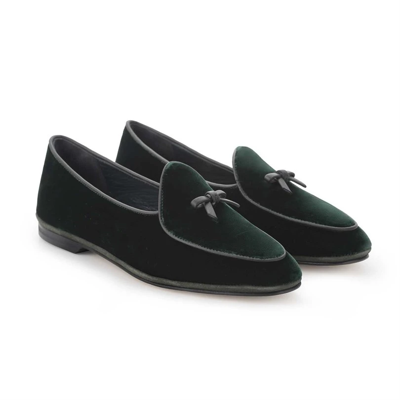 A shoe that is delicate, soft and designed to balance the ease and comfort of a slipper with the durability of a traditional loafer. Hand made in Italy, these are crafted with a suede leather outer and malleable leather sole, and finished with a leather trim and bow on top.