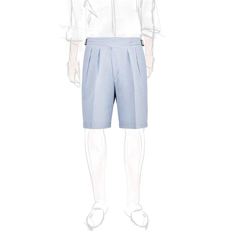 Crafted from a premium blend of 82% wool, 10% silk, and 8% linen, these shorts provide a soft, breathable feel that is perfect for warm weather. The light blue stripes add a touch of sophistication, making them suitable for both casual outings and more formal occasions.