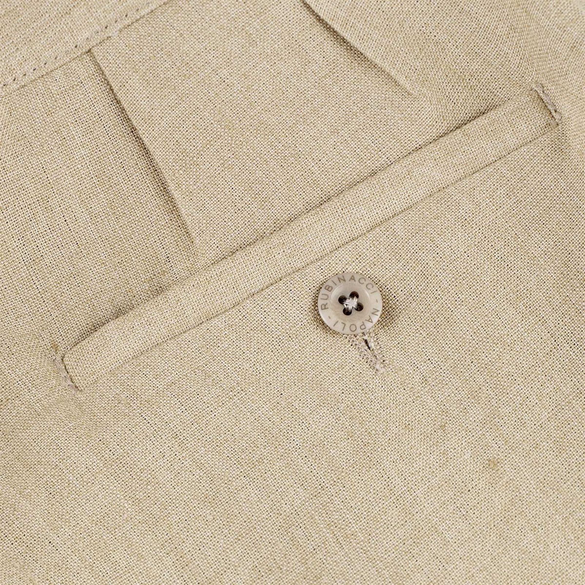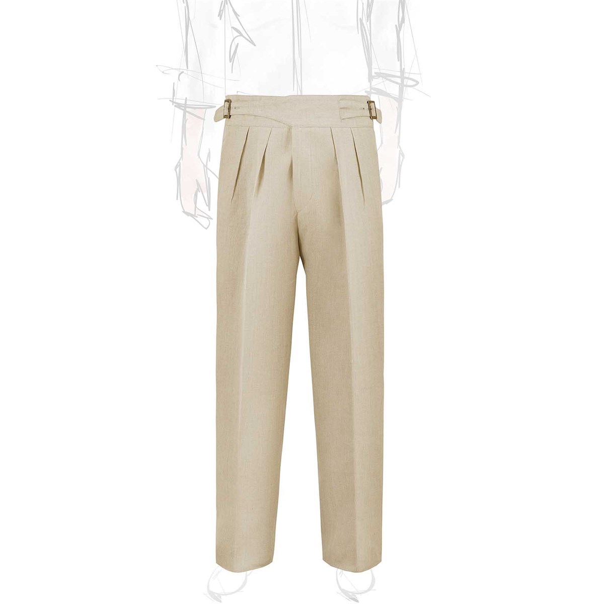 Tailored in Italy from a vintage linen with a wide and slightly higher waist-band, which became brand’s signature cummerbund-style, they feature extended side adjusters and double pleats through the front. While these create plenty of room through the waist, the tapered leg allows for a slim fit, creating a polished overall finish.