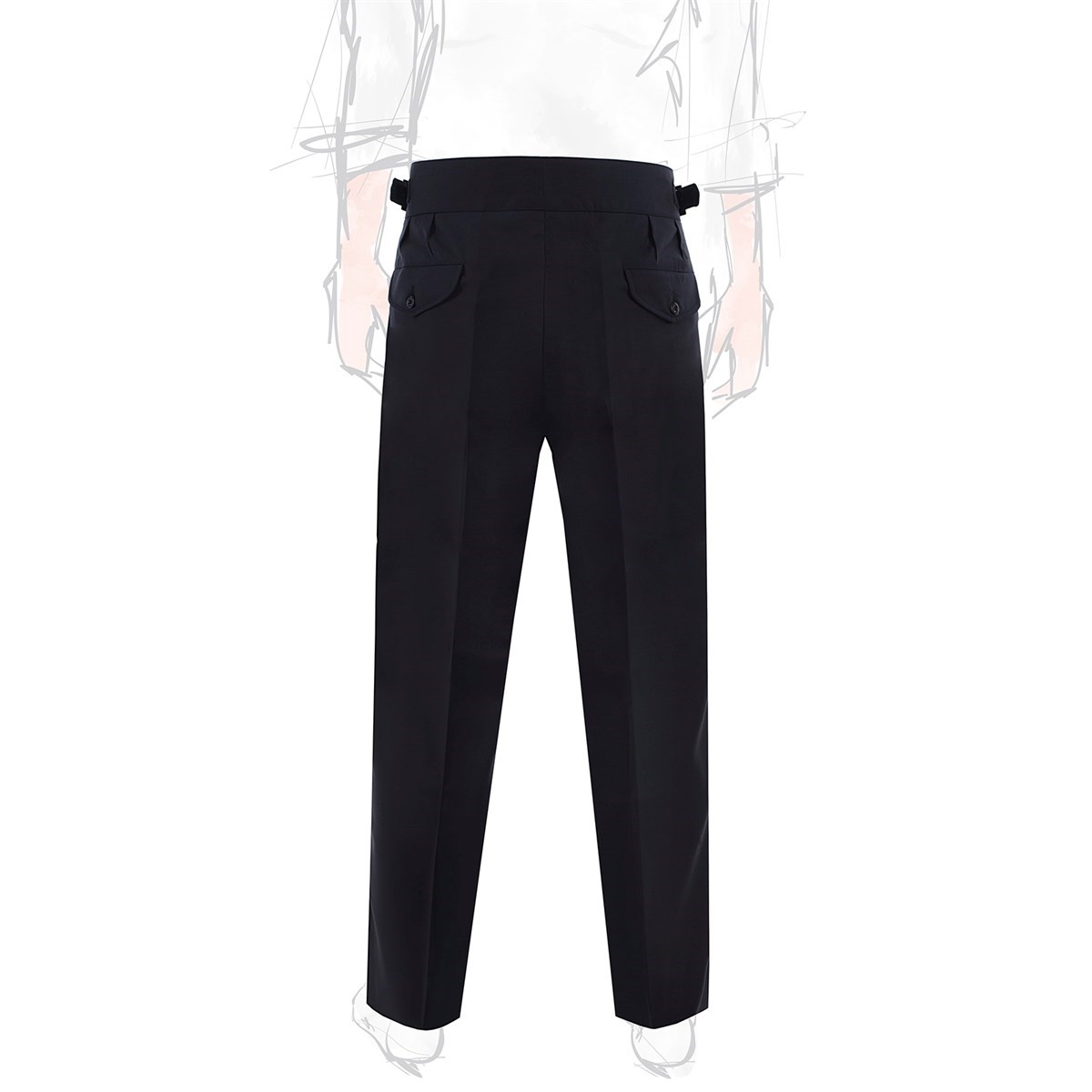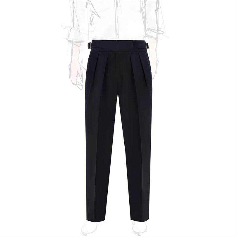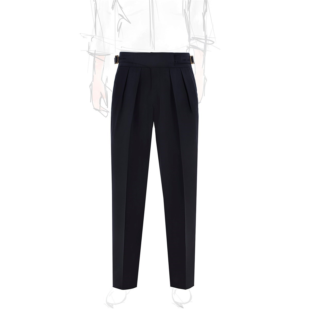 Expertly crafted from 100% Tasmanian wool, these trousers offer exceptional durability and a luxurious feel. The high waist design ensures a flattering silhouette, while the unique adjustable tabs provide a customizable fit, freeing you from the constraints of a traditional belt. The non-woven hems are meticulously finished, adding to the overall elegance of the piece.