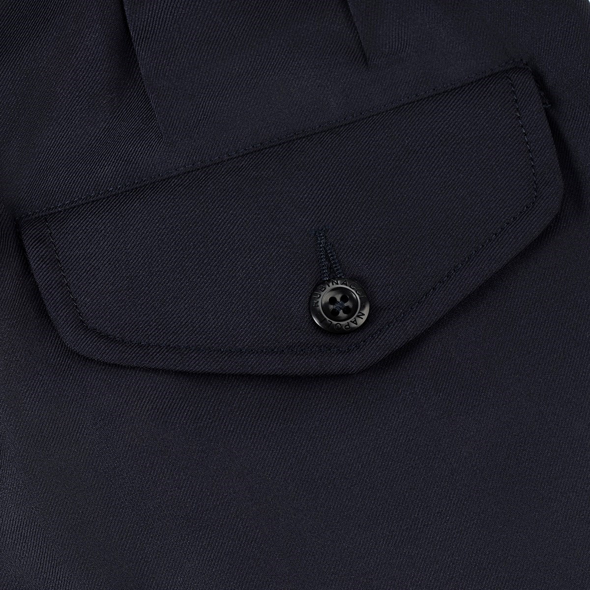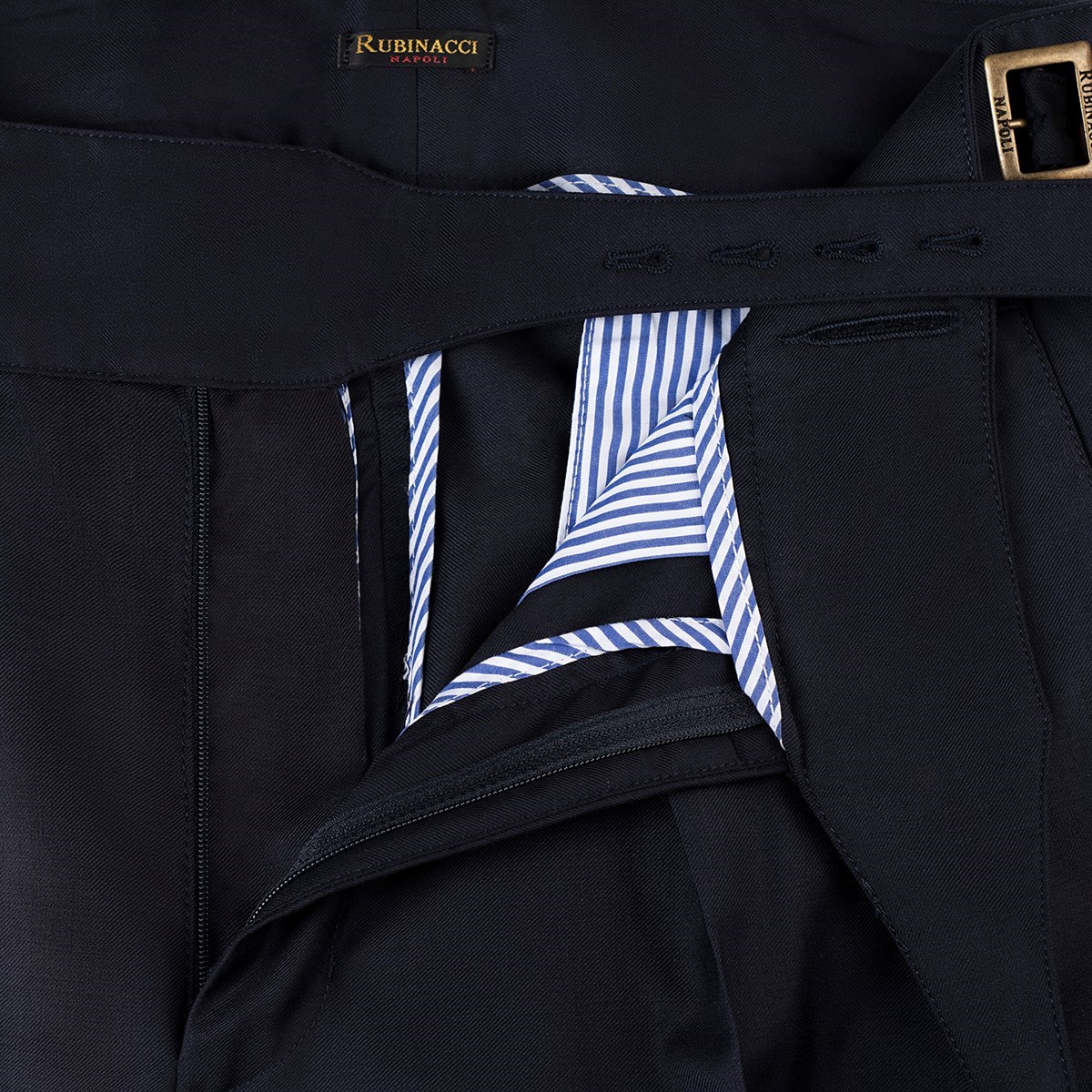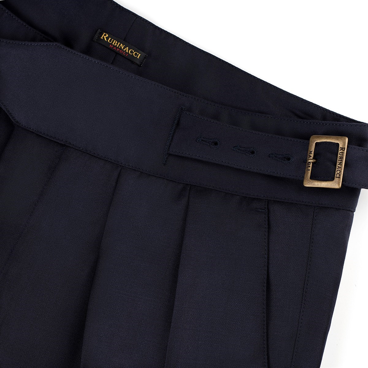 Expertly crafted from 100% Tasmanian wool, these trousers offer exceptional durability and a luxurious feel. The high waist design ensures a flattering silhouette, while the unique adjustable tabs provide a customizable fit, freeing you from the constraints of a traditional belt. The non-woven hems are meticulously finished, adding to the overall elegance of the piece.
