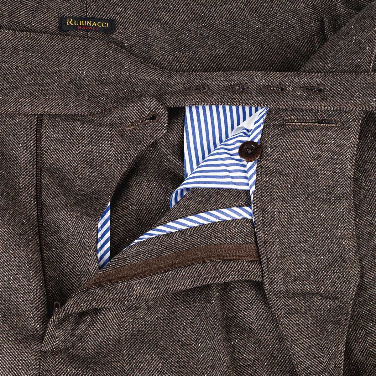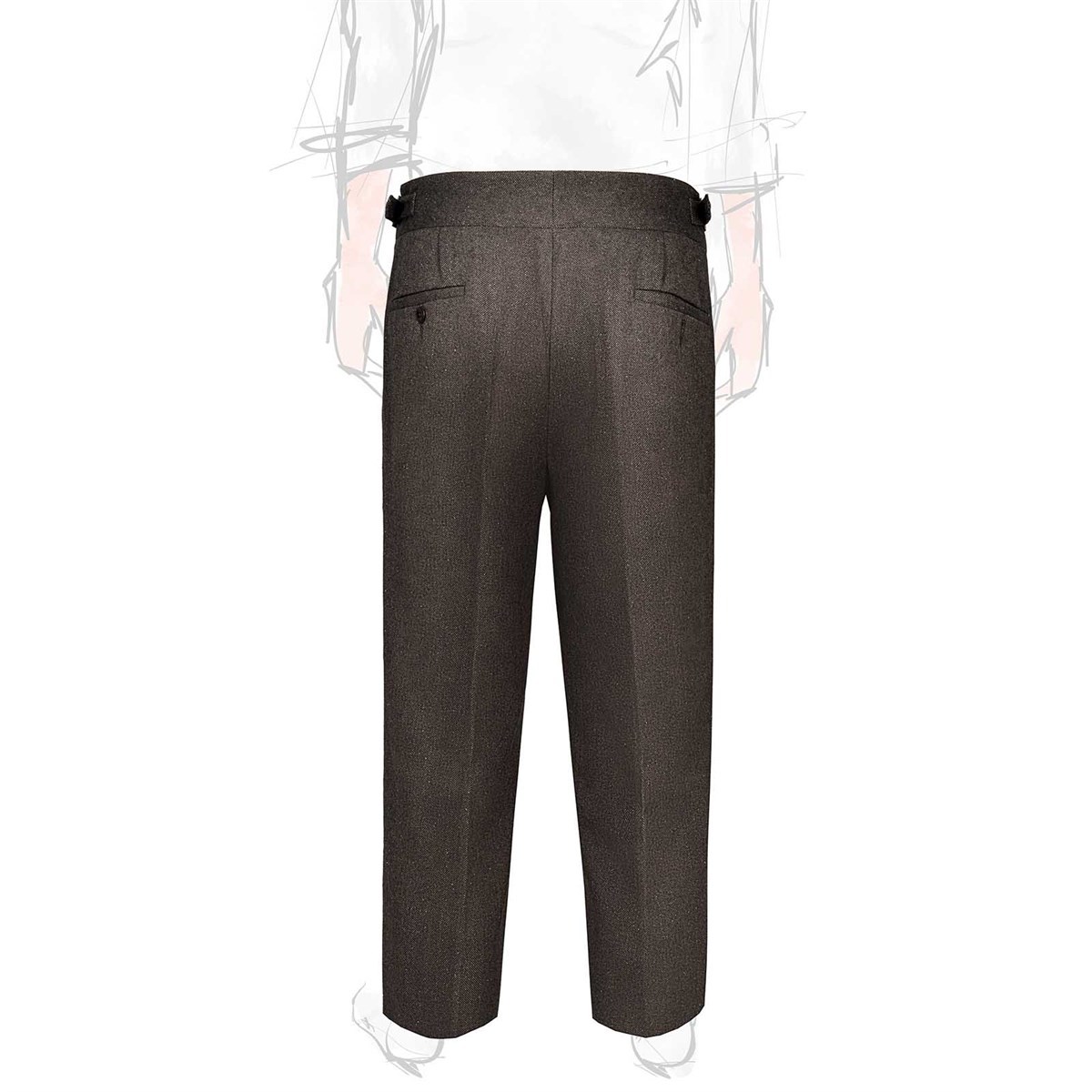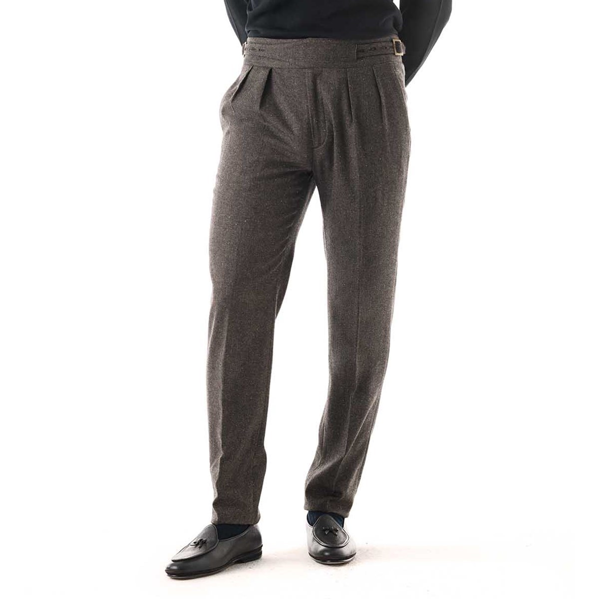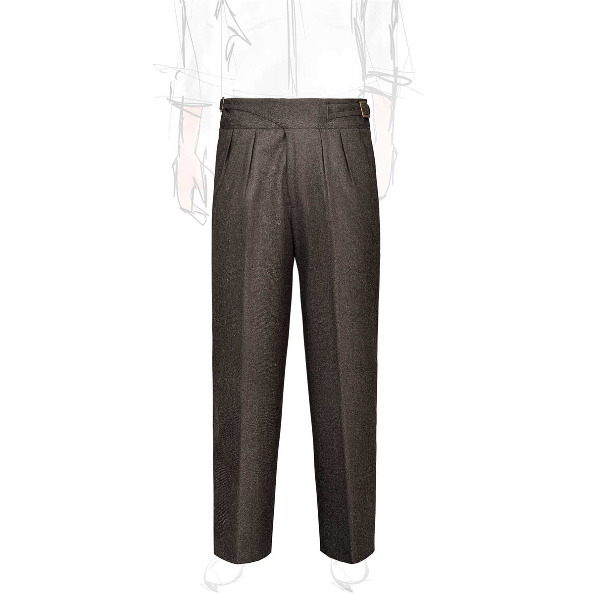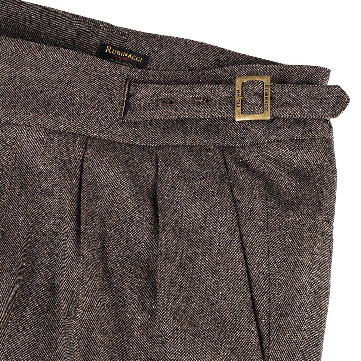 The manny trousers from the Autumn/Winter 2025 collection reinterpret the iconic style of Gurkha military uniforms with contemporary elegance. Crafted from a refined brown herringbone fabric, these trousers combine sharp lines and sartorial details with a modern, comfortable fit. A product of Rubinacci’s artisanal excellence, each piece is designed for the man who seeks quality, character, and timeless style. The high waist with double buckles and adjustable side tabs enhances the silhouette, giving the look a distinctive and sophisticated character. Made from a luxurious fabric composed of 82% virgin wool, 9% cashmere, and 9% silk, these trousers offer a premium blend that ensures warmth, softness, and a subtle natural sheen—perfect for facing the colder season with style.