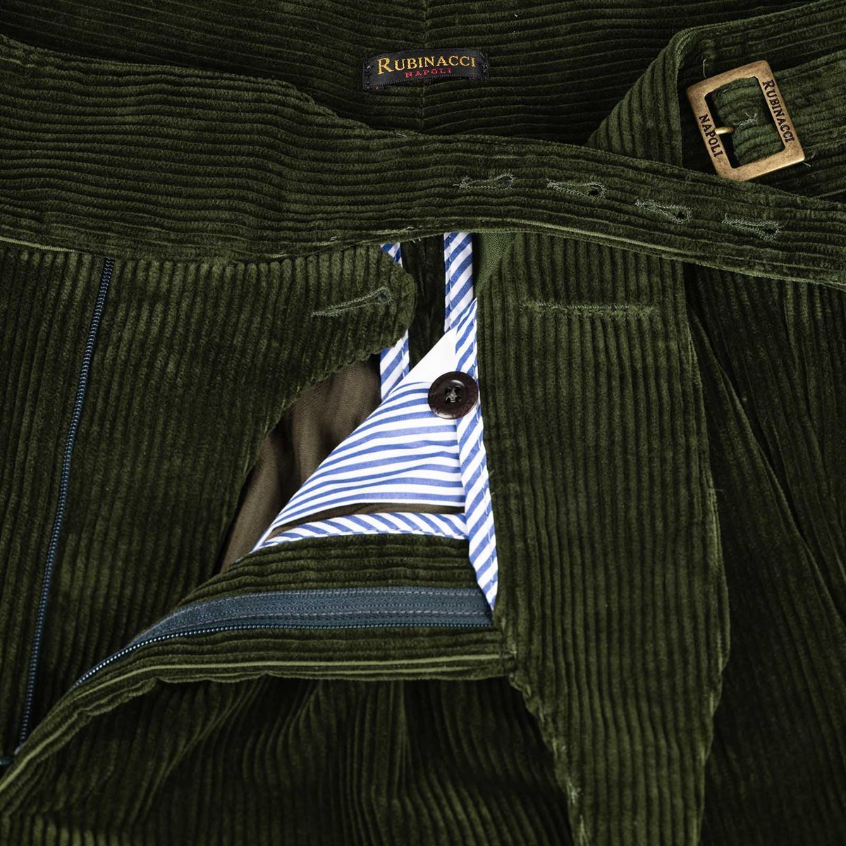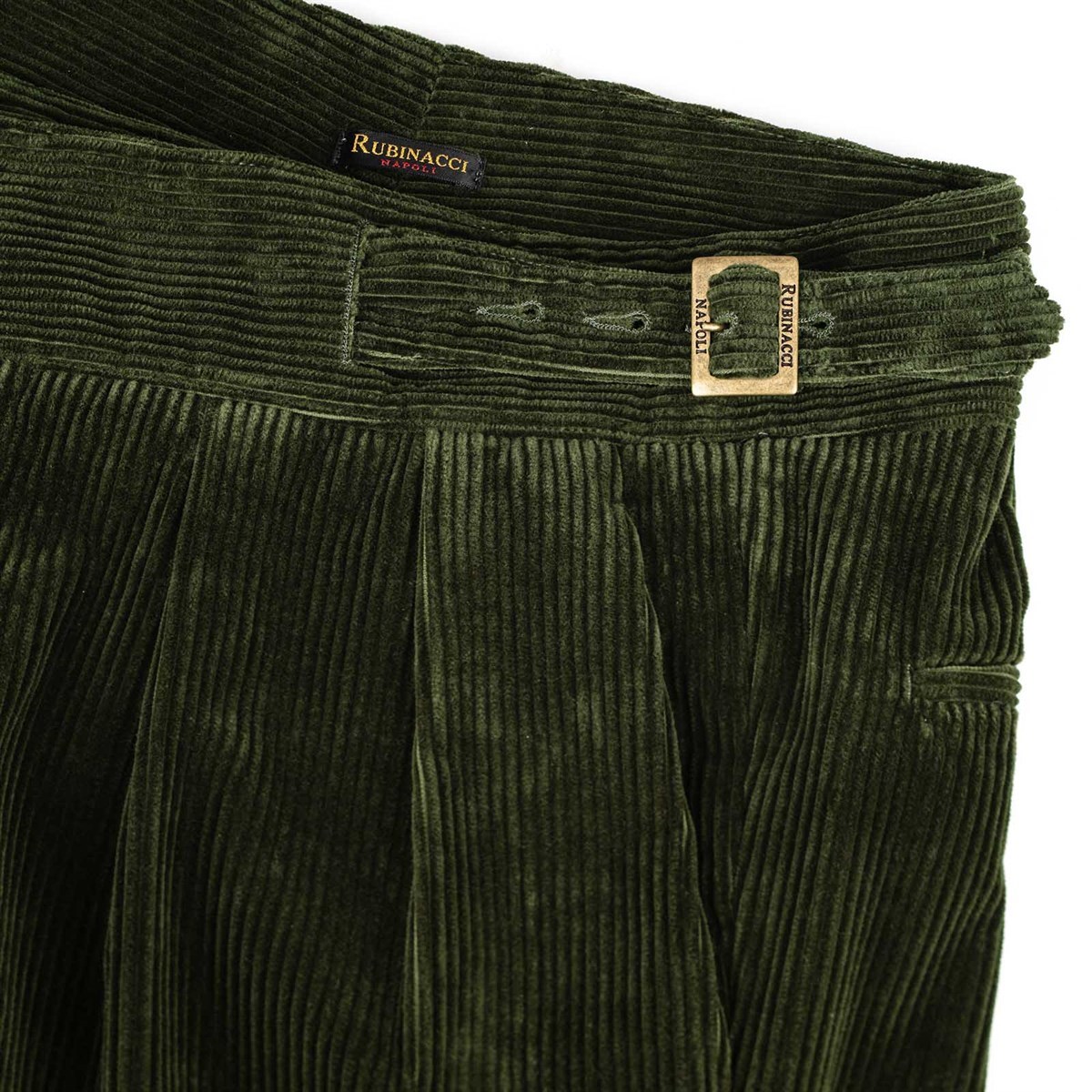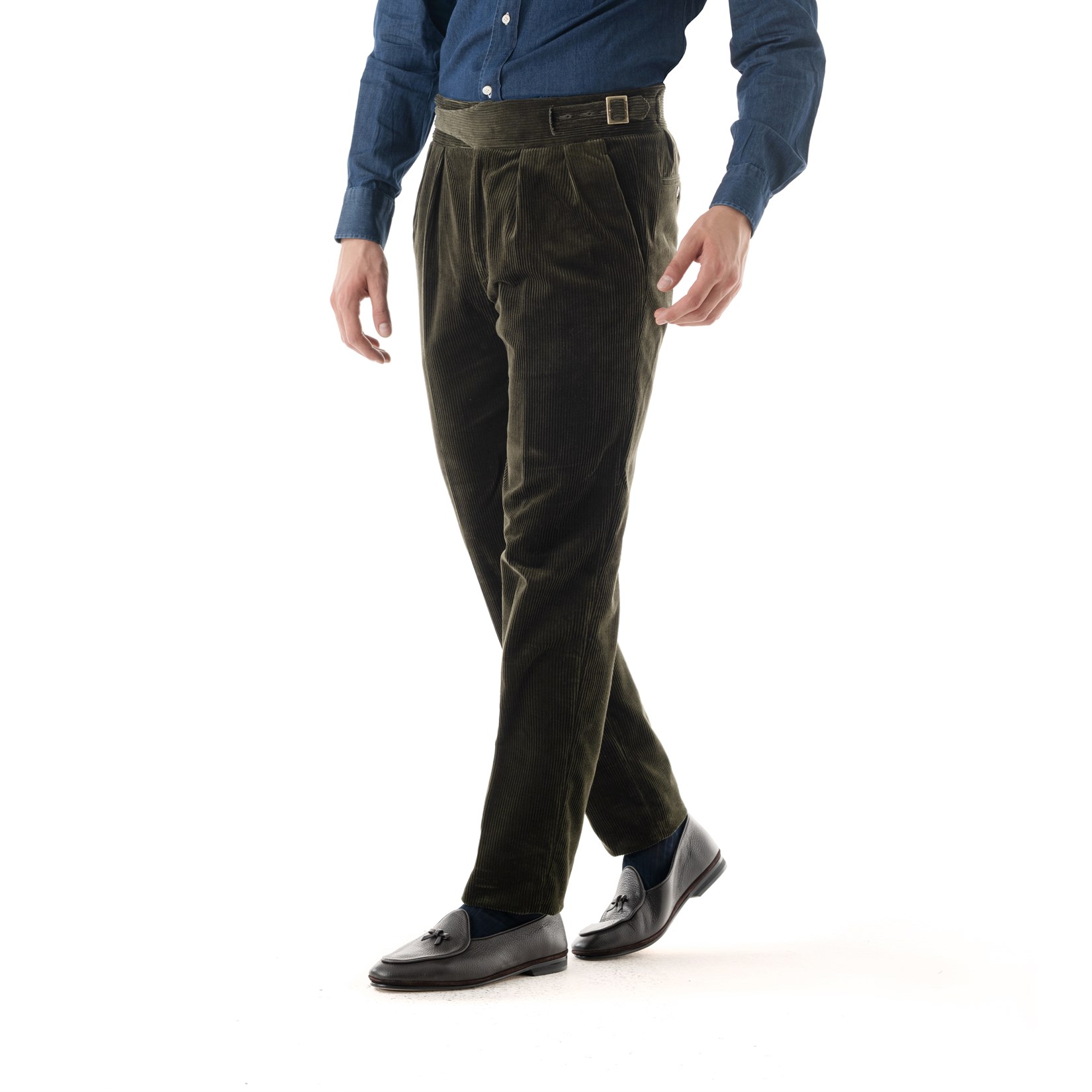 The manny trousers from the Autumn/Winter 2025 collection reinterpret the iconic style of Gurkha military uniforms with contemporary elegance. Made from a fine green corduroy in pure cotton, these trousers combine sharp lines and tailored details with a modern and comfortable fit. The corduroy, with its rich and textured feel, features a shimmering effect: the color shifts slightly depending on the light and the direction of the fabric, adding depth and dynamism to the garment. A product of Rubinacci’s artisanal excellence, each pair is designed for the man who seeks quality, character, and timeless style. The high waist with double buckles and adjustable side tabs enhances the silhouette and adds a distinctive touch, while the corduroy structure makes them ideal for facing the colder months with both style and comfort.