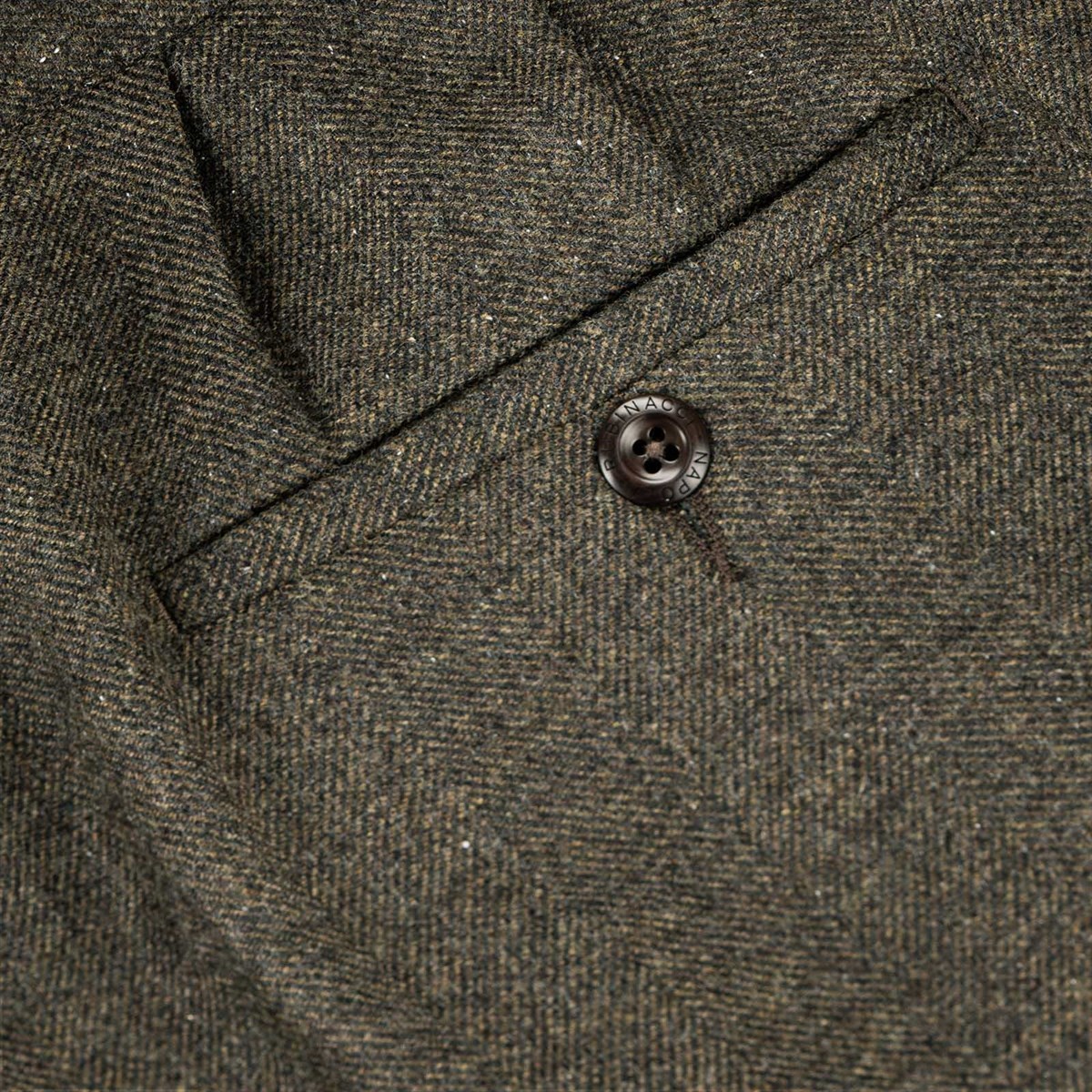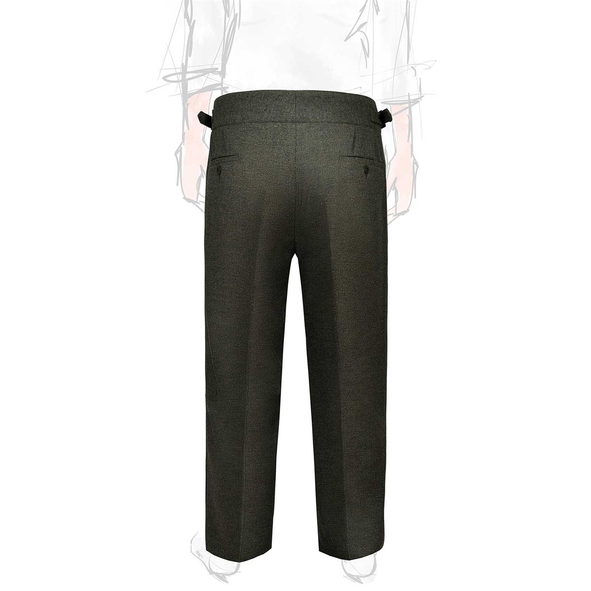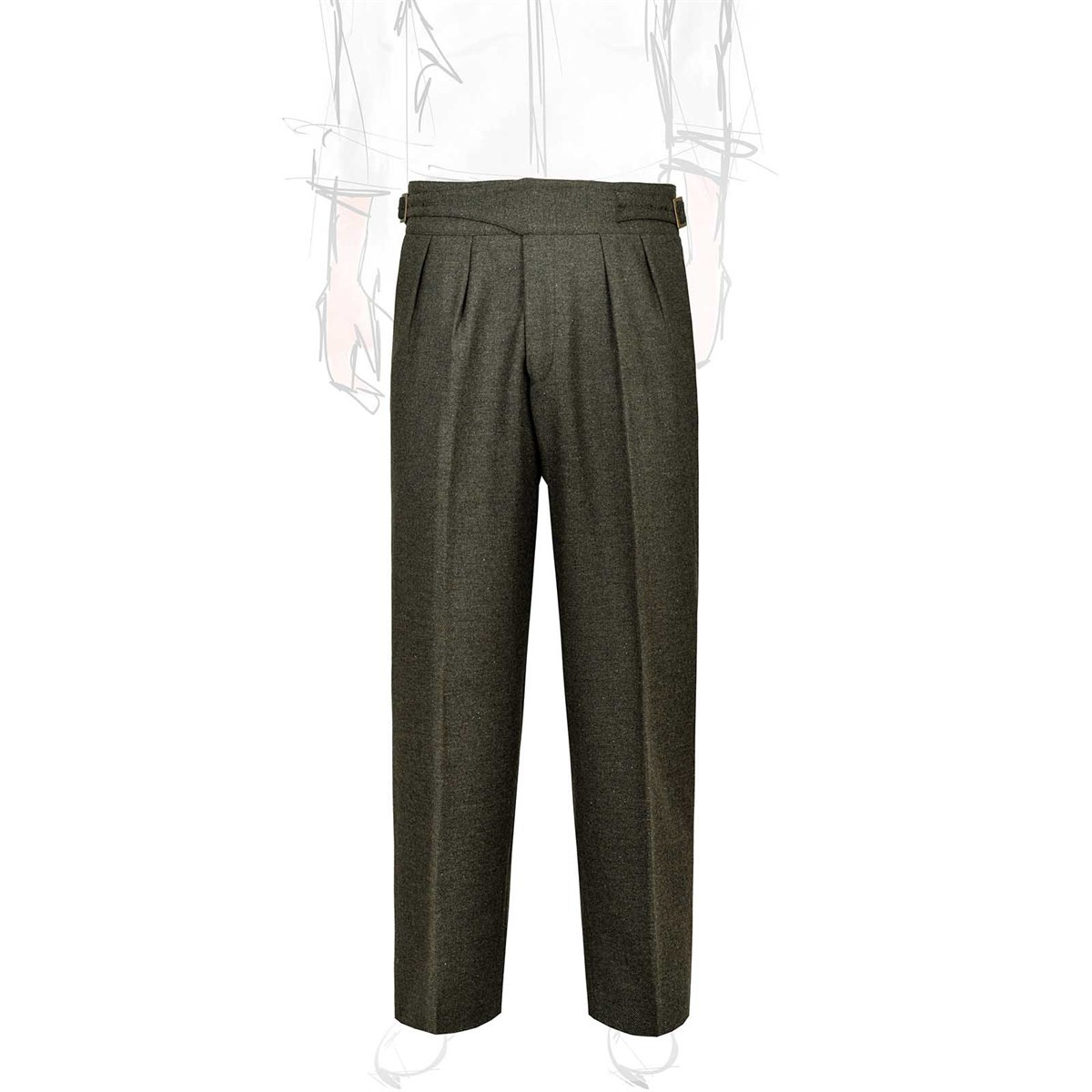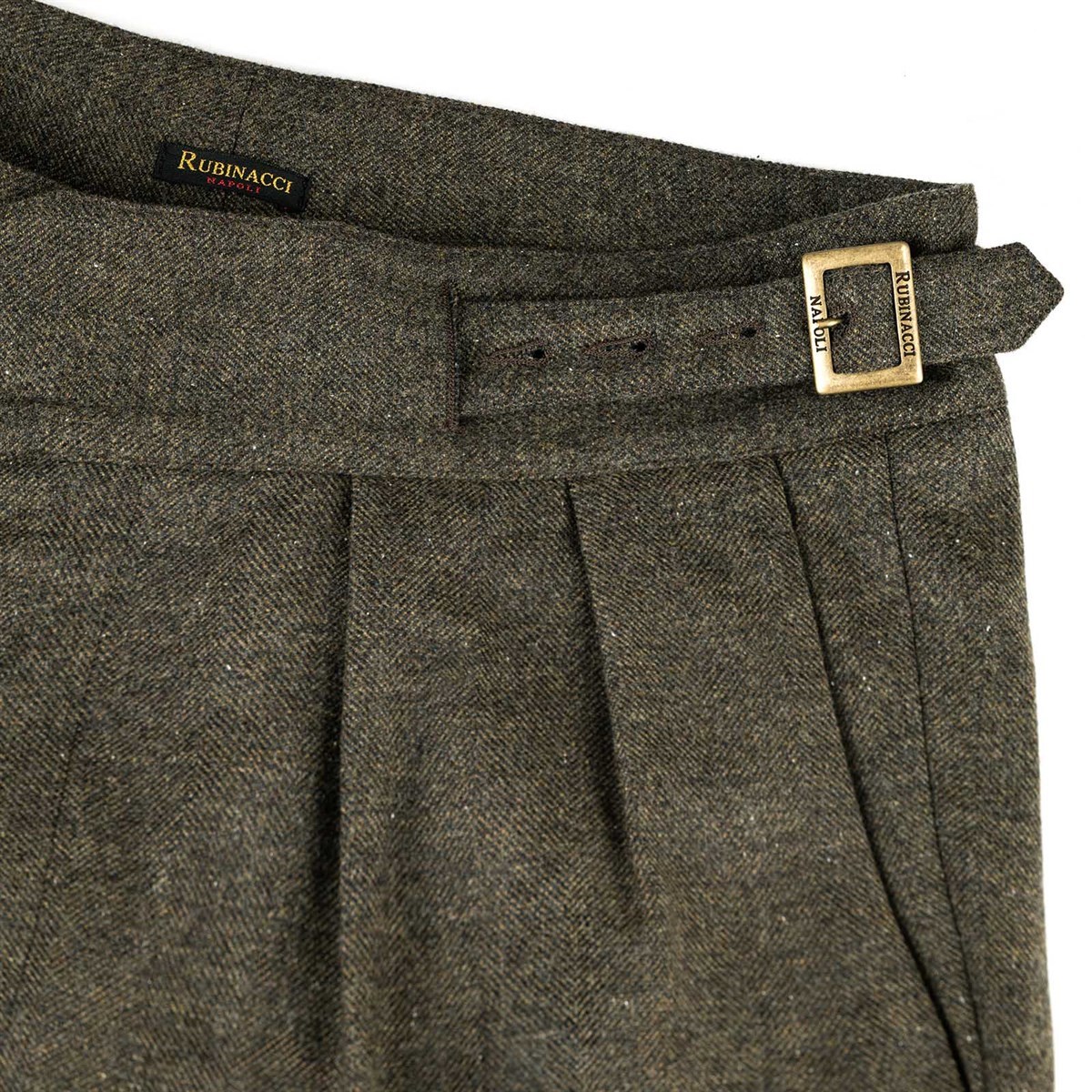 The manny trousers from the Autumn/Winter 2025 collection reinterpret the iconic style of Gurkha military uniforms with contemporary elegance. Crafted from a refined green herringbone fabric, these trousers combine sharp lines and sartorial details with a modern, comfortable fit. A product of Rubinacci’s artisanal excellence, each piece is designed for the man who seeks quality, character, and timeless style. The high waist with double buckles and adjustable side tabs enhances the silhouette, giving the look a distinctive and sophisticated character. Made from a luxurious fabric composed of 82% virgin wool, 9% cashmere, and 9% silk, these trousers offer a premium blend that ensures warmth, softness, and a subtle natural sheen—perfect for facing the colder season with style.