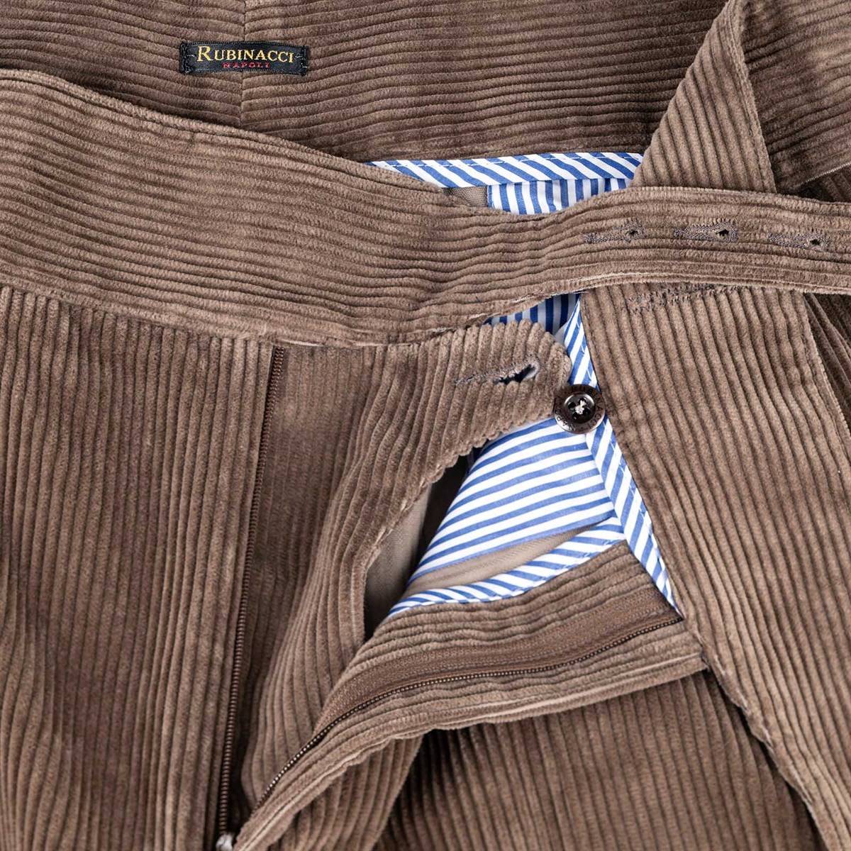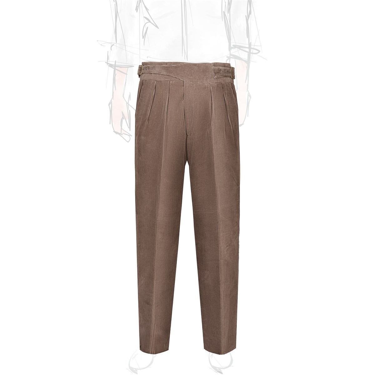 The manny trousers from the Autumn/Winter 2025 collection reinterpret the iconic style of Gurkha military uniforms with contemporary elegance. Made from a fine brown corduroy in pure cotton, these trousers combine sharp lines and tailored details with a modern and comfortable fit. The corduroy, with its rich and textured feel, features a shimmering effect: the color shifts slightly depending on the light and the direction of the fabric, adding depth and dynamism to the garment. A product of Rubinacci’s artisanal excellence, each pair is designed for the man who seeks quality, character, and timeless style. The high waist with double buckles and adjustable side tabs enhances the silhouette and adds a distinctive touch, while the corduroy structure makes them ideal for facing the colder months with both style and comfort.