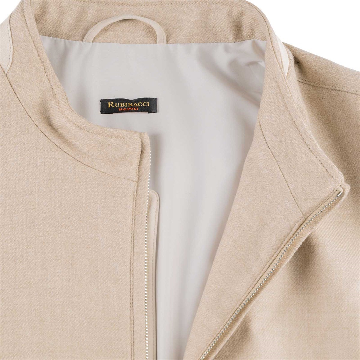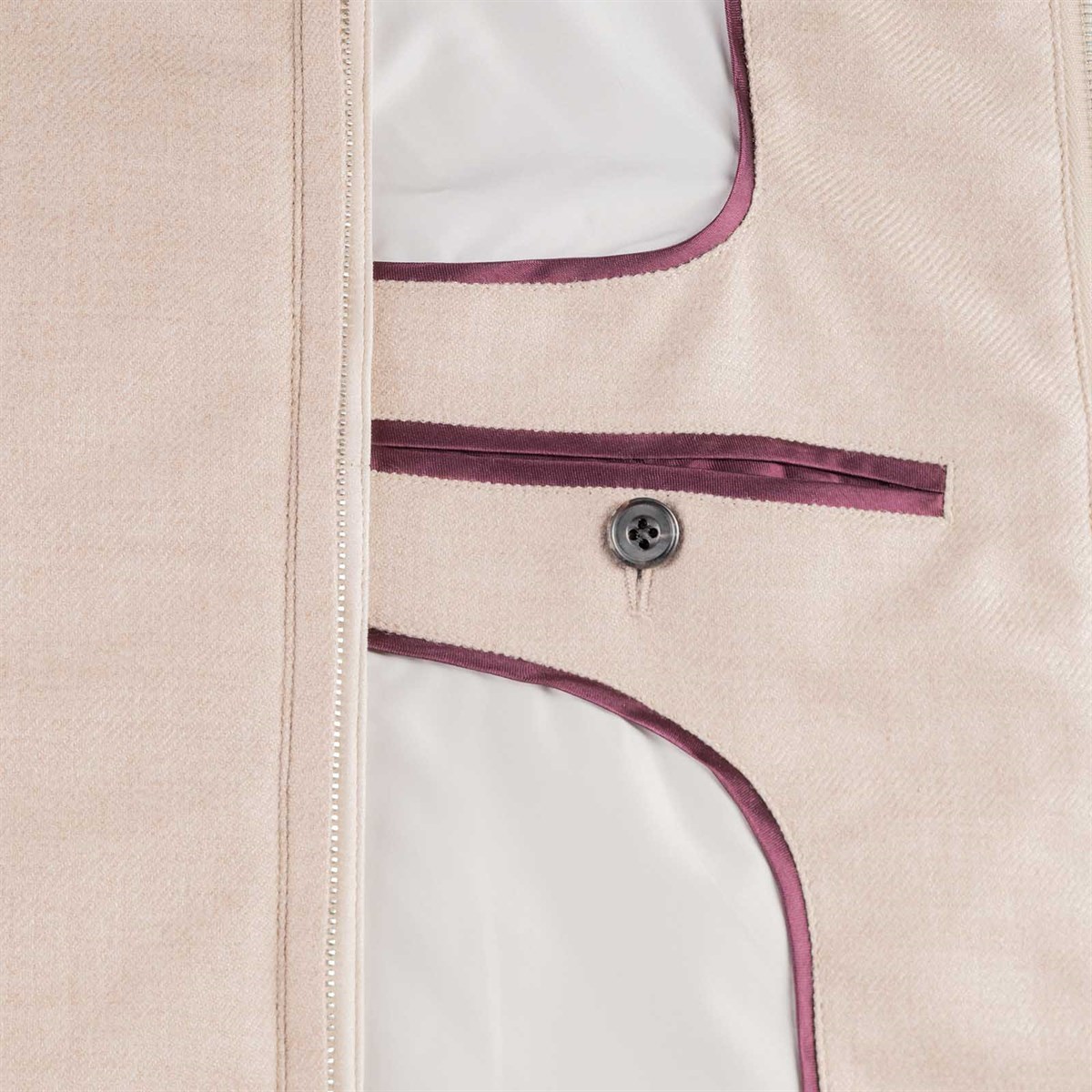 Featuring a refined mandarin collar, the vest is designed with a front zip closure and slanted side pockets, enriched with contrasting beige goat leather inserts — a detail echoed along the zipper and the collar finishes, reflecting the brand's meticulous attention to detail. The interior is fully lined in light grey and finished with a contrasting burgundy piping, a tribute to Rubinacci's distinctive and sophisticated aesthetic. Two discreet internal side pockets complete the design, ideal for keeping small essentials safe and close at hand. Perfect as a transitional outerwear piece, this vest is designed for the man who seeks versatility without compromising on Italian sartorial style.