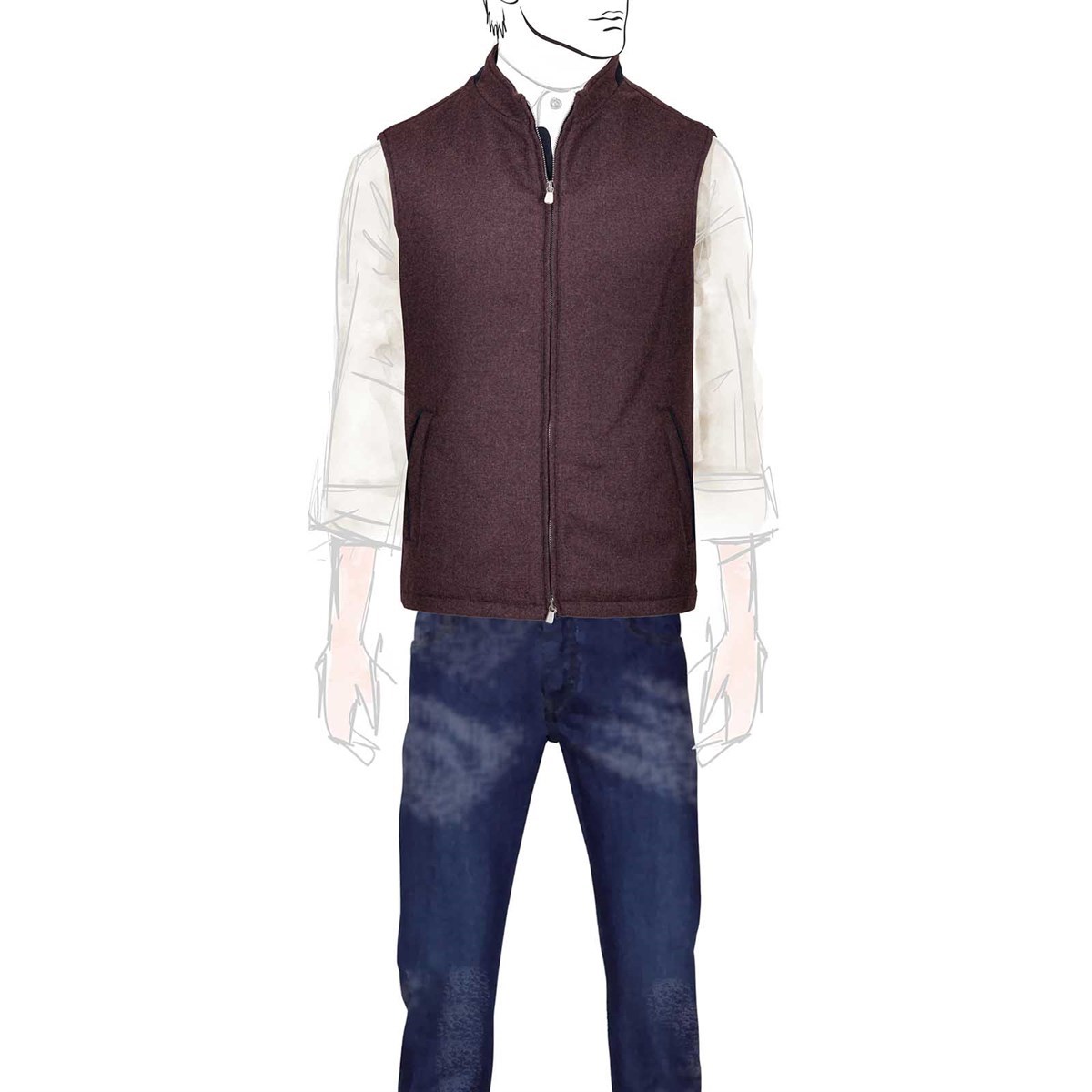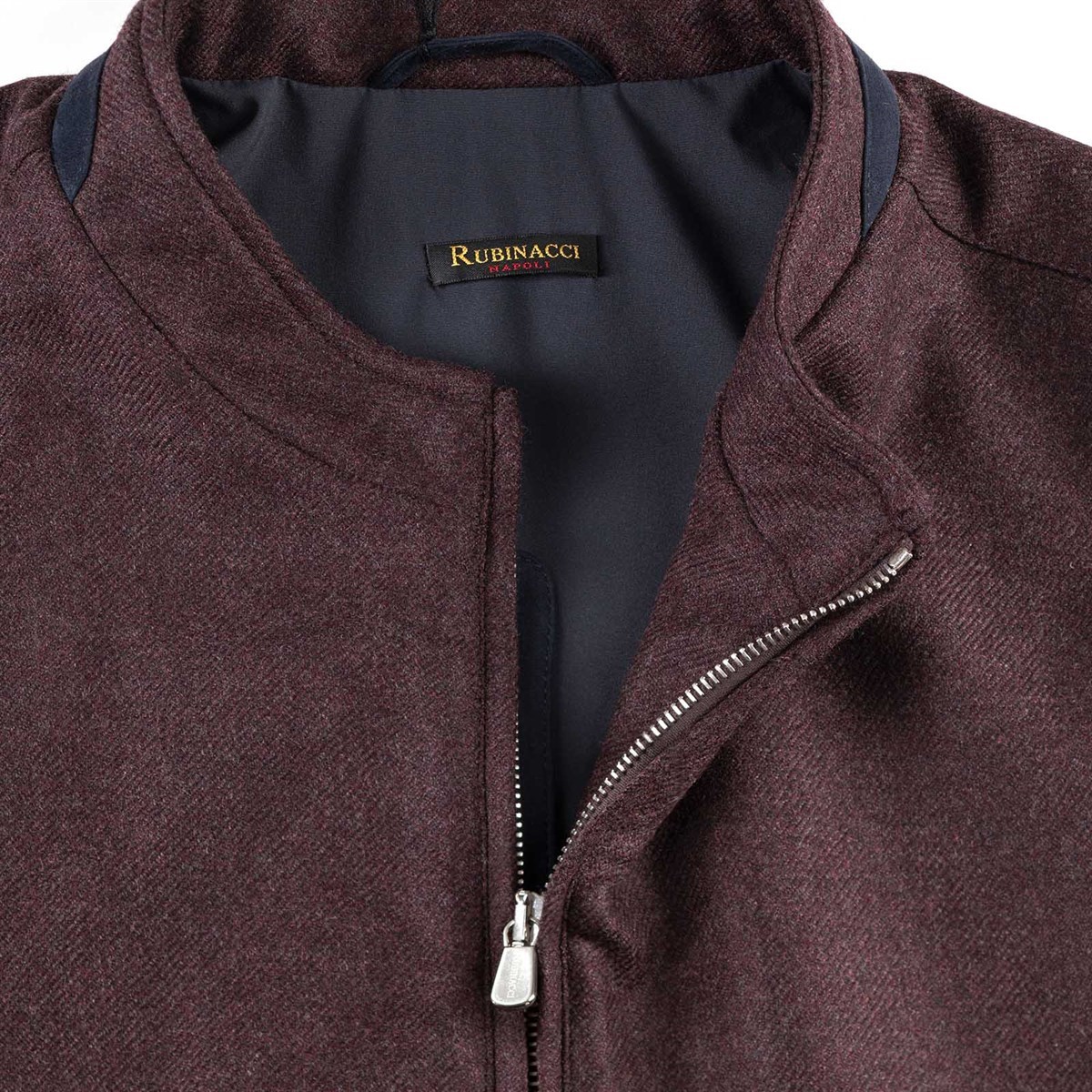 Featuring a refined mandarin collar, the vest is designed with a front zip closure and slanted side pockets, enriched with contrasting blue goat leather inserts — a detail echoed along the zipper and the collar finishes, reflecting the brand's meticulous attention to detail. The interior is fully lined in blue and finished with a contrasting burgundy piping, a tribute to Rubinacci's distinctive and sophisticated aesthetic. Two discreet internal side pockets complete the design, ideal for keeping small essentials safe and close at hand. Perfect as a transitional outerwear piece, this vest is designed for the man who seeks versatility without compromising on Italian sartorial style.