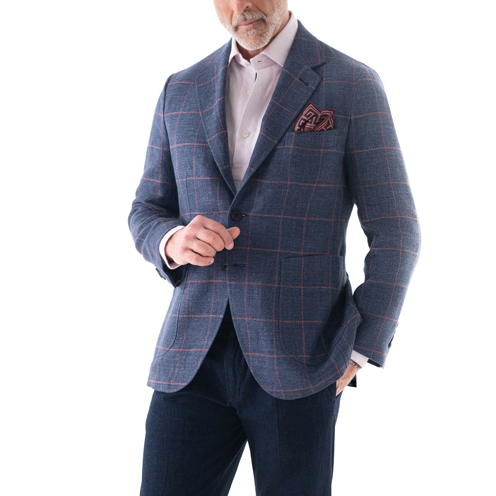 This single-breasted linen-cotton jacket, deconstructed and completely unlined, features a regular fit. The tailored construction is defined by three buttons, pressed to a two-button stance, a classic lapel, patch pockets, and a double vent. The fabric, soft to the touch and crafted from natural fibres, is decorated with intriguing pink checks, making it perfect for the summer season while highlighting the personality and style of the wearer. The contrasting burgundy internal piping, a distinctive hallmark of Maison Rubinacci, emphasizes attention to detail and the careful selection of materials. Perfect for those who appreciate Rubinacci tailoring, where quality of materials and refinement coexist in every stitch. The sleeve buttonholes are left closed to allow for possible length alterations.