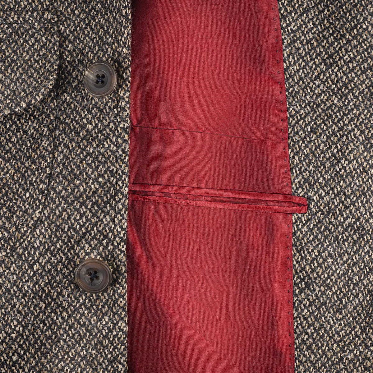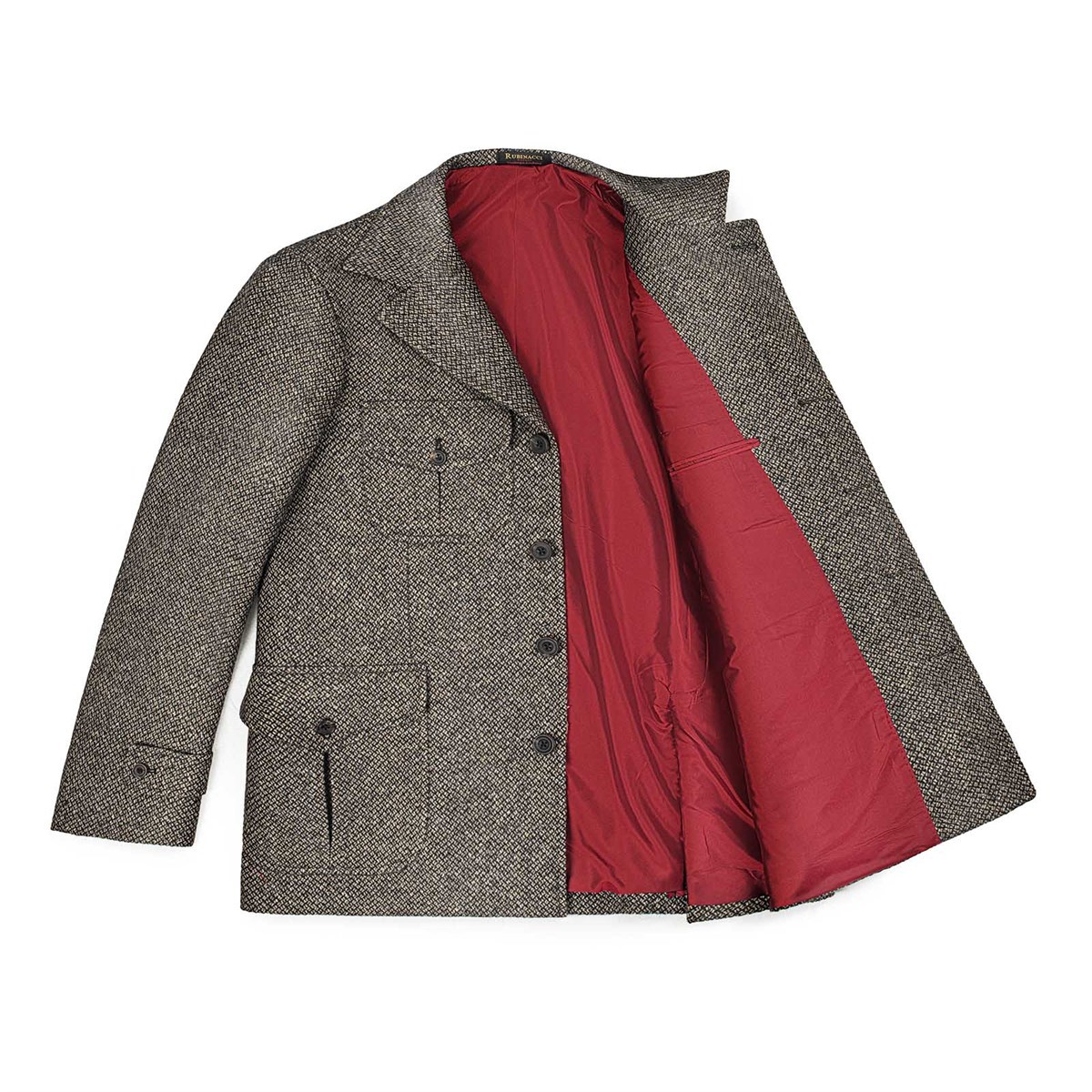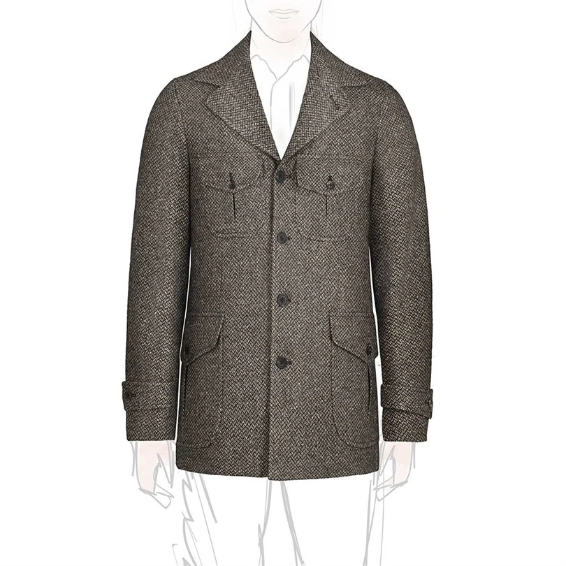The interior is adorned with an exquisite 100% red silk lining, adding a touch of luxury to the overall design. You'll find refined welt pockets within the lining, while the exterior showcases versatile patch pockets, a hallmark of classic safari jackets.