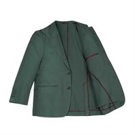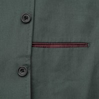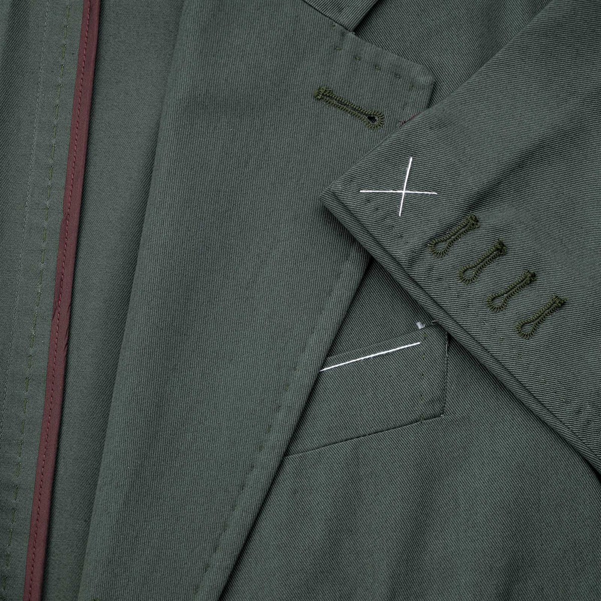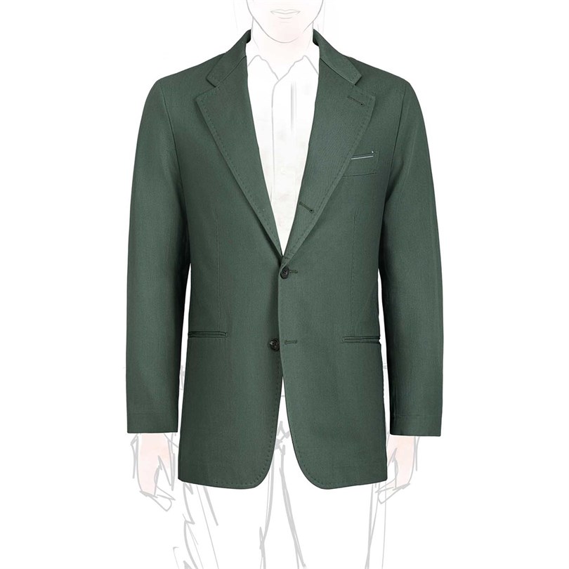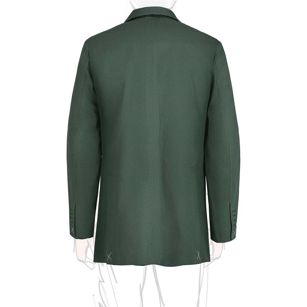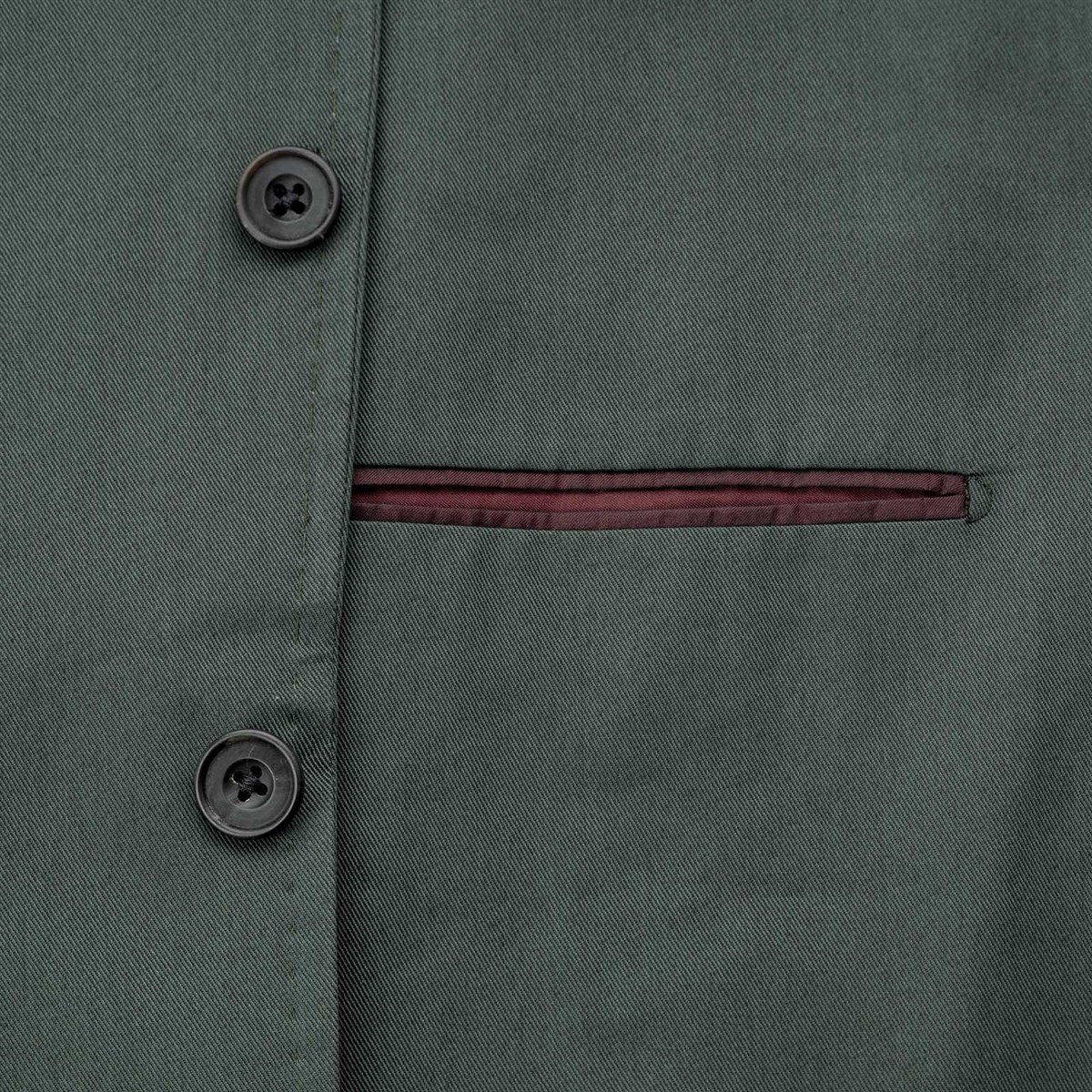 This sophisticated single-breasted blazer features three meticulously crafted horn buttons and functional patch pockets, blending classic design with modern sensibilities. The jacket is unlined, enhancing its lightweight feel and making it an ideal choice for layering during transitional seasons. The soft green cotton, sourced from the 1990s, offers a luxurious touch against the skin, while its light yet durable composition ensures longevity.